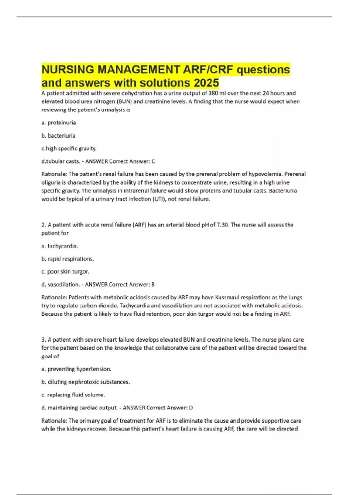 A patient admitted with severe dehydration has a urine output of 380 ml over the next 24 hours and elevated blood urea nitrogen (BUN) and creatinine levels. A finding that the nurse would expect when reviewing the patient's urinalysis is a. proteinuria b. bacteriuria specific gravity. ar casts. - ANSWER Correct Answer: C Rationale: The patient's renal failure has been caused by the prerenal problem of hypovolemia. Prerenal oliguria is characterized by the ability of the kidneys to concentrate urine, resulting in a high urine specific gravity. The urinalysis in intrarenal failure would show proteins and tubular casts. Bacteriuria would be typical of a urinary tract infection (UTI), not renal failure. 2. A patient with acute renal failure (ARF) has an arterial blood pH of 7.30. The nurse will assess the patient for a. tachycardia. b. rapid respirations. c. poor skin turgor. d. vasodilation. - ANSWER Correct Answer: B Rationale: Patients with metabolic acidosis caused by ARF may have Kussmaul respirations as the lungs try to regulate carbon dioxide. Tachycardia and vasodilation are not associated with metabolic acidosis. Because the patient is likely to have fluid retention, poor skin turgor would not be a finding in ARF. 3. A patient with severe heart failure develops elevated BUN and creatinine levels. The nurse plans care for the patient based on the knowledge that collaborative care of the patient will be directed toward the goal of a. preventing hypertension. b. diluting nephrotoxic substances. c. replacing fluid volume. d. maintaining cardiac outpu