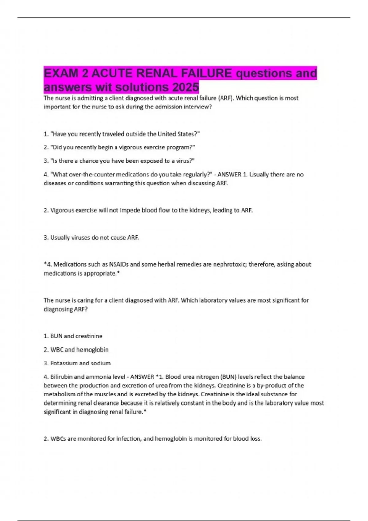 The nurse is admitting a client diagnosed with acute renal failure (ARF). Which question is most important for the nurse to ask during the admission interview? 1. "Have you recently traveled outside the United States?" 2. "Did you recently begin a vigorous exercise program?" 3. "Is there a chance you have been exposed to a virus?" 4. "What over-the-counter medications do you take regularly?" - ANSWER 1. Usually there are no diseases or conditions warranting this question when discussing ARF. 2. Vigorous exercise will not impede blood flow to the kidneys, leading to ARF. 3. Usually viruses do not cause ARF. *4. Medications such as NSAIDs and some herbal remedies are nephrotoxic; therefore, asking about medications is appropriate.* The nurse is caring for a client diagnosed with ARF. Which laboratory values are most significant for diagnosing ARF? 1. BUN and creatinine 2. WBC and hemoglobin 3. Potassium and sodium 4. Bilirubin and ammonia level - ANSWER *1. Blood urea nitrogen (BUN) levels reflect the balance between the production and excretion of urea from the kidneys. Creatinine is a by-product of the metabolism of the muscles and is excreted by the kidneys. Creatinine is the ideal substance for determining renal clearance because it is relatively constant in the body and is the laboratory value most significant in diagnosing renal failure.*