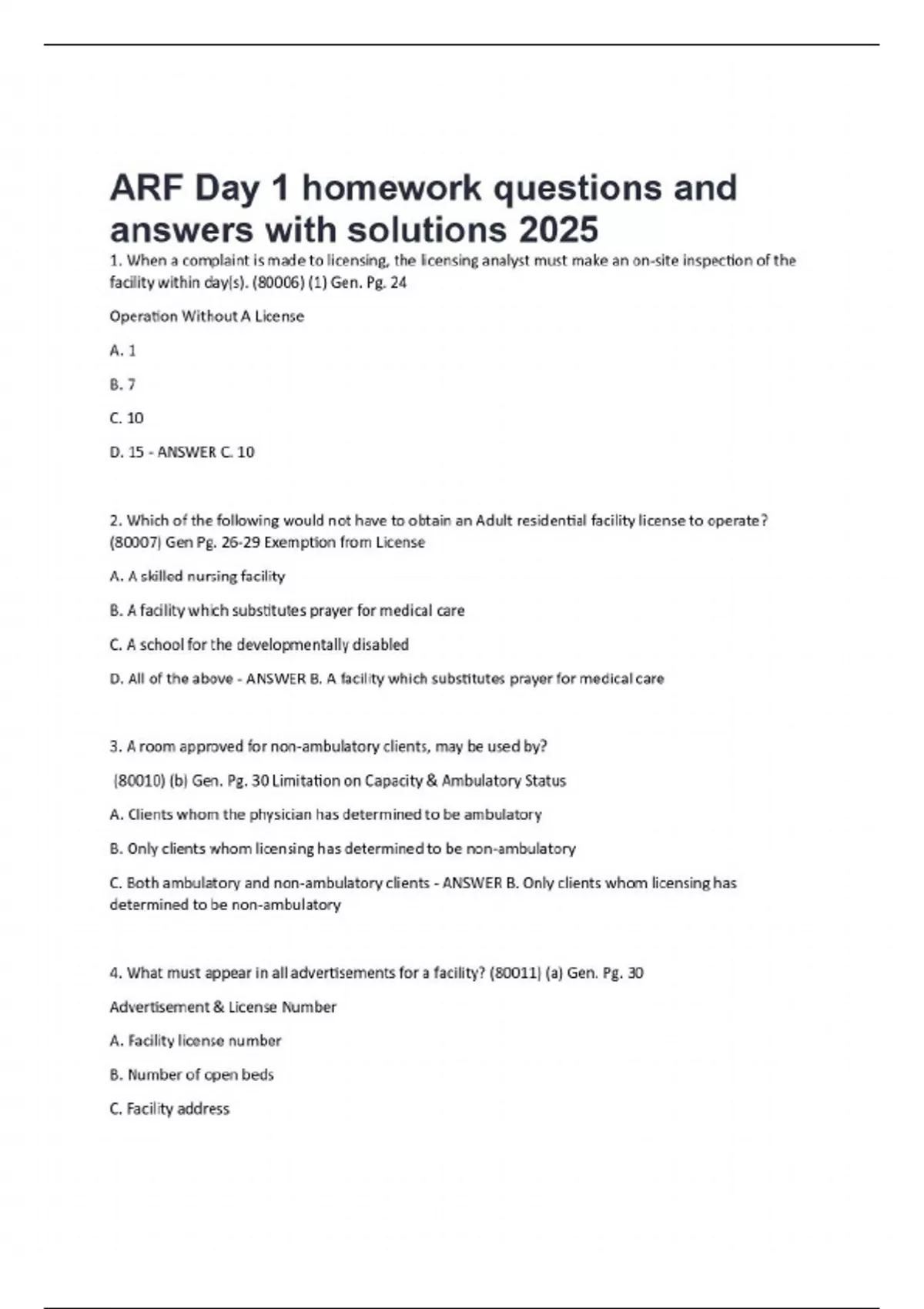 1. When a complaint is made to licensing, the licensing analyst must make an on-site inspection of the facility within day(s). (80006) (1) Gen. Pg. 24 Operation Without A License A. 1 B. 7 C. 10 D. 15 - ANSWER C. 10 2. Which of the following would not have to obtain an Adult residential facility license to operate? (80007) Gen Pg. 26-29 Exemption from License A. A skilled nursing facility B. A facility which substitutes prayer for medical care C. A school for the developmentally disabled D. All of the above - ANSWER B. A facility which substitutes prayer for medical care 3. A room approved for non-ambulatory clients, may be used by? (80010) (b) Gen. Pg. 30 Limitation on Capacity & Ambulatory Status A. Clients whom the physician has determined to be ambulatory B. Only clients whom licensing has determined to be non-ambulatory C. Both ambulatory and non-ambulatory clients - ANSWER B. Only clients whom licensing has determined to be non-ambula