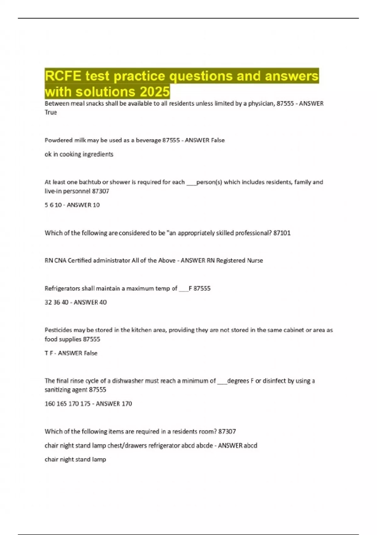 Between meal snacks shall be available to all residents unless limited by a physician, 87555 - ANSWER True Powdered milk may be used as a beverage 87555 - ANSWER False ok in cooking ingredients At least one bathtub or shower is required for each ___person(s) which includes residents, family and live-in personnel 87307 5 6 10 - ANSWER 10 Which of the following are considered to be "an appropriately skilled professional? 87101 RN CNA Certified administrator All of the Above - ANSWER RN Registered Nurse Refrigerators shall maintain a maximum temp of ___F 87555 32 36 40 - ANSWER 40 Pesticides may be stored in the kitchen area, providing they are not stored in the same cabinet or area as food supplies 87555 T F - ANSWER False The final rinse cycle of a dishwasher must reach a minimum of ___degrees F or disinfect by using a sanitizing agent 87555 - ANSW