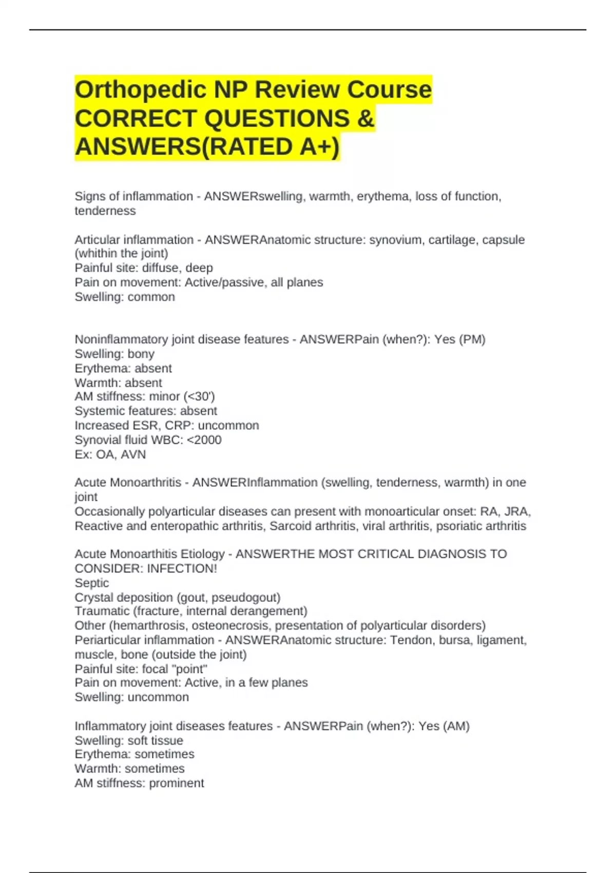 Acute Monoarthritis - ANSWERInflammation (swelling, tenderness, warmth) in one