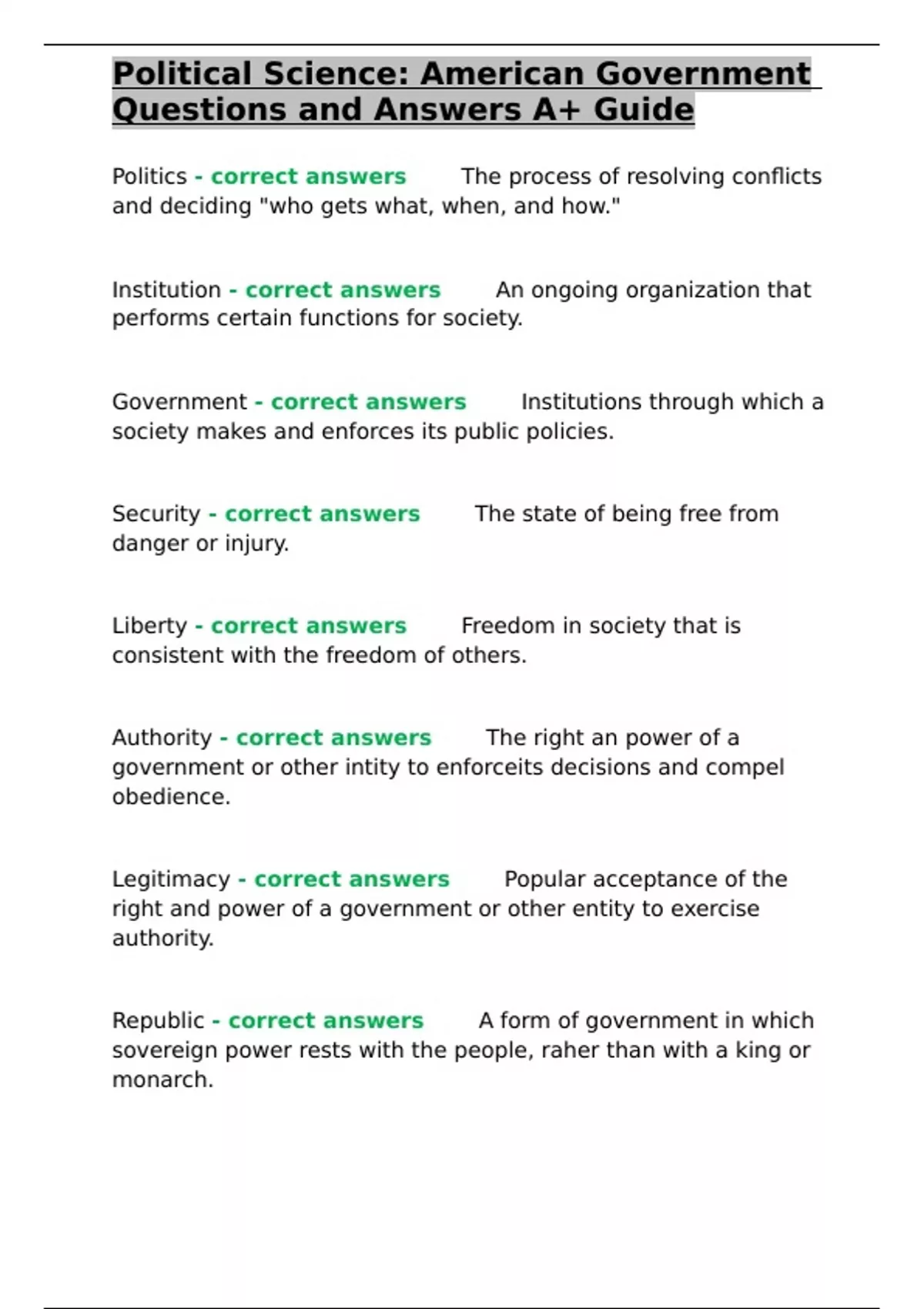 Liberty - correct answers✅✅Freedom in society that is