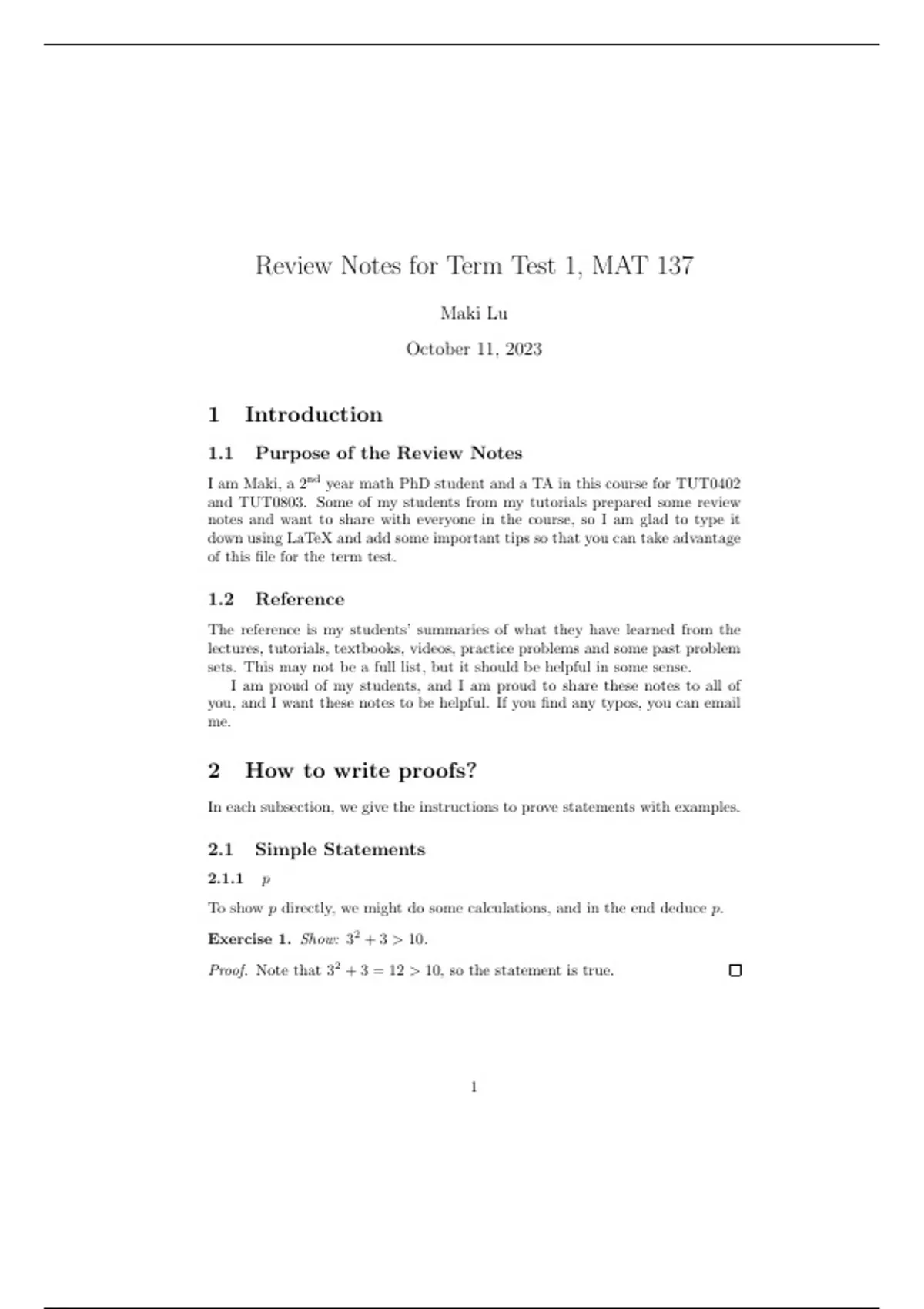 I am Maki, a 2nd year math PhD student and a TA in this course for TUT0402 and TUT0803. Some of my students from my tutorials prepared some review notes and want to share with everyone in the course, so I am glad to type it down using LaTeX and add some important tips so that you can take advantage of this file for the term test.