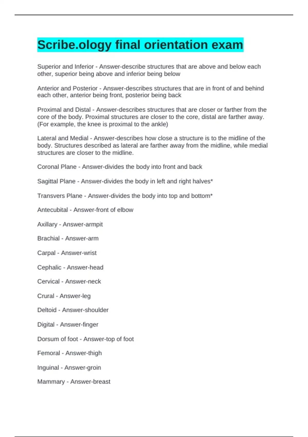 S final orientation exam Superior and Inferior - Answer-describe structures that are above and below each other, superior being above and inferior being below Anterior and Posterior - Answer-describes structures that are in front of and behind each other, anterior being front, posterior being back Proximal and Distal - Answer-describes structures that are closer or farther from the core of the body. Proximal structures are closer to the core, distal are farther away. (For example, the knee is proximal to the ankle) Lateral and Medial - Answer-describes how close a structure is to the midline of the body. Structures described as lateral are farther away from the midline, while medial structures are closer to the midline. Coronal Plane - Answer-divides the body into front and back Sagittal Plane - Answer-divides the body in left and right halves* Transvers Plane - Answer-divides the body into top and bottom* Antecubital - Answer-front of elbow Axillary - Answer-armpit Brachial - Answer-arm Carpal - Answer-wrist Cephalic - Answer-head Cervical - Answer-neck Crural - Answer-leg Deltoid - Answer-shoulder Digital - Answer-finger Dorsum of foot - Answer-top of foot Femoral - Answer-thigh Inguinal - Answer-groin Mammary - Answer-breast