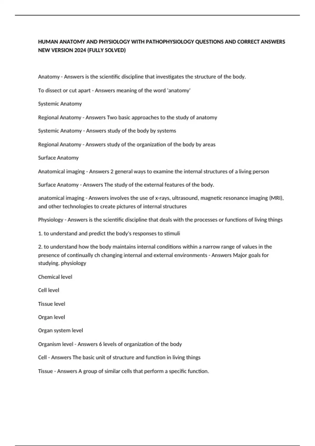 HUMAN ANATOMY AND PHYSIOLOGY WITH PATHOPHYSIOLOGY QUESTIONS AND CORRECT ANSWERS NEW VERSION 2024 (FULLY SOLVED) Anatomy - Answers is the scientific discipline that investigates the structure of the body. To dissect or cut apart - Answers meaning of the word 'anatomy' Systemic Anatomy Regional Anatomy - Answers Two basic approaches to the study of anatomy Systemic Anatomy - Answers study of the body by systems Regional Anatomy - Answers study of the organization of the body by areas Surface Anatomy Anatomical imaging - Answers 2 general ways to examine the internal structures of a living person Surface Anatomy - Answers The study of the external features of the body. anatomical imaging - Answers involves the use of x-rays, ultrasound, magnetic resonance imaging (MRI), and other technologies to create pictures of internal structures Physiology - Answers is the scientific discipline that deals with the processes or functions of living things 1. to understand and predict the body's responses to stimuli 2. to understand how the body maintains internal conditions within a narrow range of values in the presence of continually ch changing internal and external environments - Answers Major goals for studying. physiology Chemical level Cell level Tissue level Organ level Organ system level Organism level - Answers 6 levels of organization of the body Cell - Answers The basic unit of structure and function in living things Tissue - Answers A group of similar cells that perform a specific function. Organ - Answers is composed of two or more tissue types that together perform one or more common functions Organ systems - Answers a group of organs classified as a unit because of a common function or set of functions Organization Metabolism Responsiveness Growth Development Reproduction - Answers six characteristics of life Organization - Answers refers to the specific relationship of the many individual parts of na organism Metabolism - Answers is the ability to use energy to perform vital functions, such as growth, movement, and reproduction. Responsiveness - Answers is the ability of an organism to sense changes in the environment and make the adjustments that help maintain its life Differentiation - Answers is the change in cell structure and function from generalized to specialized Growth - Answers refers to the increase in size of all or part of the organism Reproduction - Answers is the formation of new cells or new organisms Homeostatic mechanisms - Answers maintains the body temperature near an average normal value or set point Negative Feedback Mechanism - Answers is when any deviation from the set point is made smaller or is resisted receptor, control center, effector - Answers three basic components of a feedback system Receptor - Answers monitors the value of a variable by detecting stimuli Control center - Answers determines the set point for the variable and receives input from the receptor about the variable Effector - Answers can change the value of the variable when directed by the control center Positive Feedback Mechanism - Answers Occurs when the deviation from the set point becomes even greater. anatomical position - Answers refers to a person standing upright with the face directed forward, the upper limbs hanging to the sides, and the palms of the hands facing forward Supine position - Answers lying on back, facing upward Prone - Answers lying face down Anterior - Answers front of the body Posterior - Answers toward the back Ventral - Answers belly Dorsal - Answers back Proximal - Answers Closer to the point of attachment Distal - Answers away from the point of attachment/ distant Medial - Answers toward the midline Lateral - Answers away from the midline Superficial - Answers refers to a structure close to the surface of the body Deep - Answers toward the interior of the body Sagital plane - Answers divides the body into left and right halves Homeostasis - Answers is the existence and maintenance of a relatively constant environment within the body despite fluctuations in either the external or internal environment Median Plane (midsagittal plane) - Answers divides the body into equal left and right halved transverse plane - Answers divides the body into superior and inferior parts frontal plane - Answers Divides the body into front and back portions. longitudinal plane - Answers cut along the length of an organ thoracic cavity - Answers surrounded by the ribcage and is separated from the abdominal cavity by the muscular diaphragm Mediastinum - Answers is a section that houses the heart, thymus, trachea, esophagus and