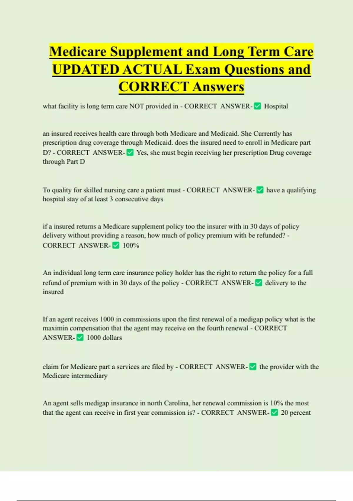 Medicare Supplement and Long Term Care UPDATED ACTUAL Exam Questions and CORRECT Answers