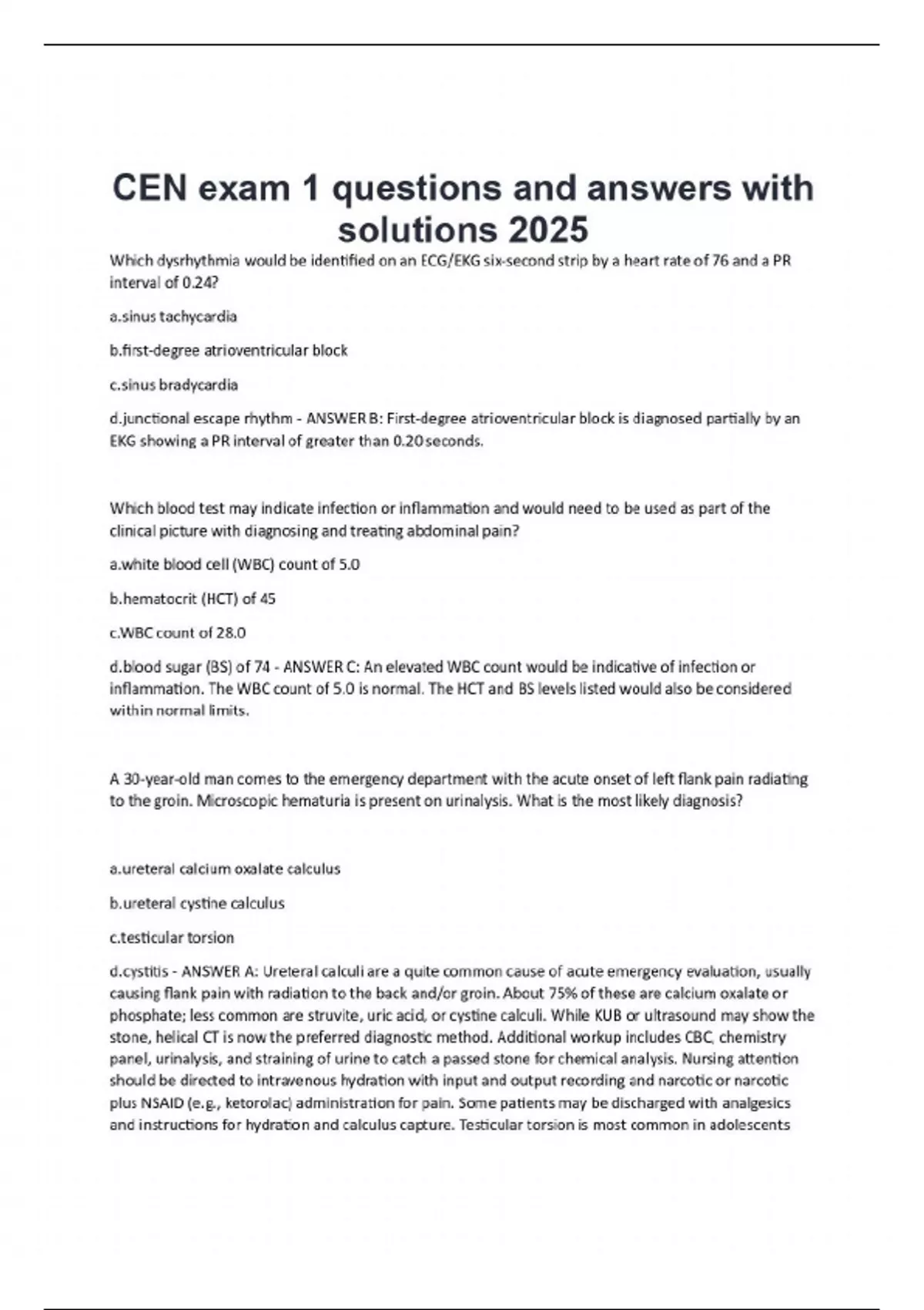 Which dysrhythmia would be identified on an ECG/EKG six-second strip by a heart rate of 76 and a PR interval of 0.24? tachycardia -degree atrioventricular block bradycardia ional escape rhythm - ANSWER B: First-degree atrioventricular block is diagnosed partially by an EKG showing a PR interval of greater than 0.20 seconds. Which blood test may indicate infection or inflammation and would need to be used as part of the clinical picture with diagnosing and treating abdominal pain? blood cell (WBC) count of 5.0 ocrit (HCT) of 45 c.WBC count of 28.0 sugar (BS) of 74 - ANSWER C: An elevated WBC count would be indicative of infection or inflammation. The WBC count of 5.0 is normal. The HCT and BS levels listed would also be considered within normal limits. A 30-year-old man comes to the emergency department with the acute onset of left flank pain radiating to the groin. Microscopic hematuria is present on urinalysis. What is the most likely diagnosis? ral calcium oxalate calculus ral cystine calculus cular torsion tis - ANSWER A: Ureteral calculi are a quite common cause of acute emergency evaluation, usually causing flank pain with radiation to the back and/or groin. About 75% of these are calcium oxalate or phosphate; less common are struvite, uric acid, or cystine calculi. While KUB or ultrasound may show the stone, helical CT is now the preferred diagnostic method. Additional workup includes CBC, chemistry panel, urinalysis, and straining of urine to catch a passed sto