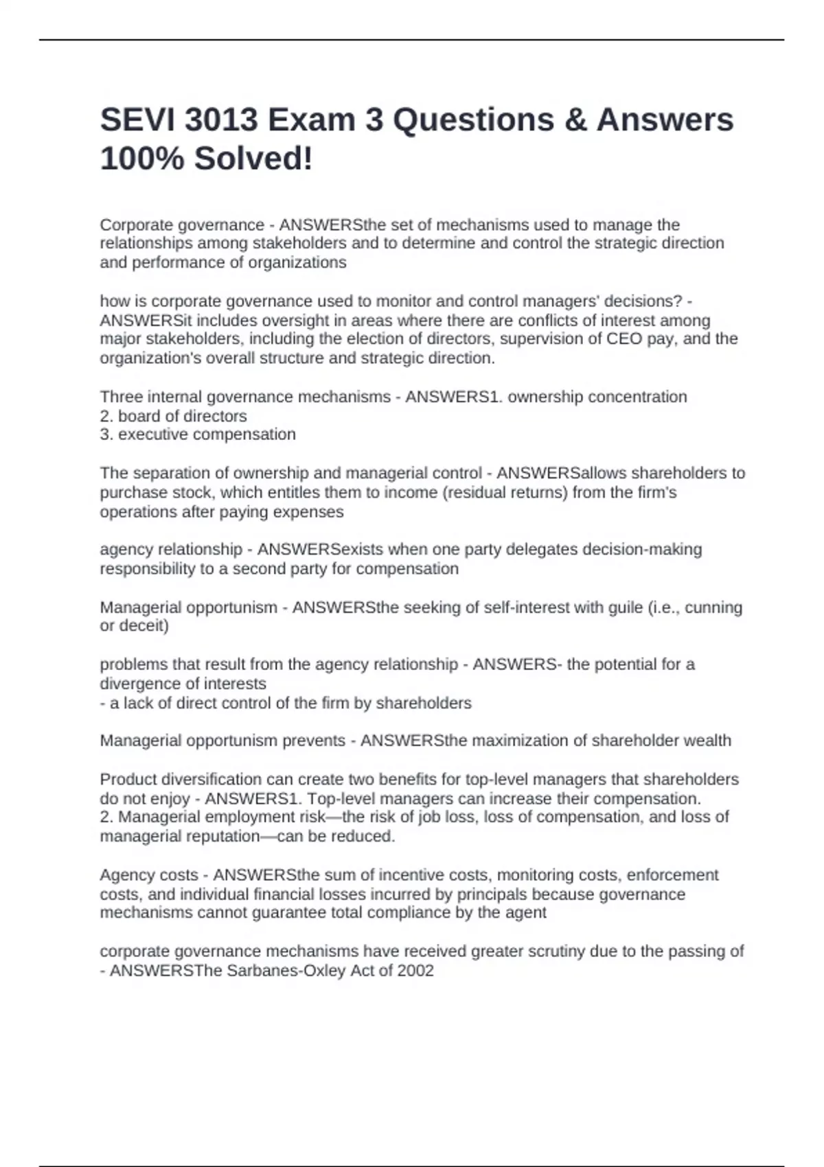 Corporate governance - ANSWERSthe set of mechanisms used to manage the relationships among stakeholders and to determine and control the strategic direction and performance of organizations how is corporate governance used to monitor and control managers' decisions? - ANSWERSit includes oversight in areas where there are conflicts of interest among major stakeholders, including the election of directors, supervision of CEO pay, and the organization's overall structure and strategic direction. Three internal governance mechanisms - ANSWERS1. ownership concentration 2. board of directors 3. executive compensation The separation of ownership and managerial control - ANSWERSallows shareholders to purchase stock, which entitles them to income (residual returns) from the firm's operations after paying expenses agency relationship - ANSWERSexists when one party delegates decision-making responsibility to a second party for compensation Managerial opportunism - ANSWERSthe seeking of self-interest with guile (i.e., cunning or deceit) problems that result from the agency relationship - ANSWERS- the potential for a divergence of interests - a lack of direct control of the firm by shareholders Managerial opportunism prevents - ANSWERSthe maximization of shareholder wealth Product diversification can create two benefits for top-level managers that shareholders do not enjoy - ANSWERS1. Top-level managers can increase their compensation. 2. Managerial employment risk—the risk of job loss, loss of compensation, and loss of managerial reputation—can be reduced. A