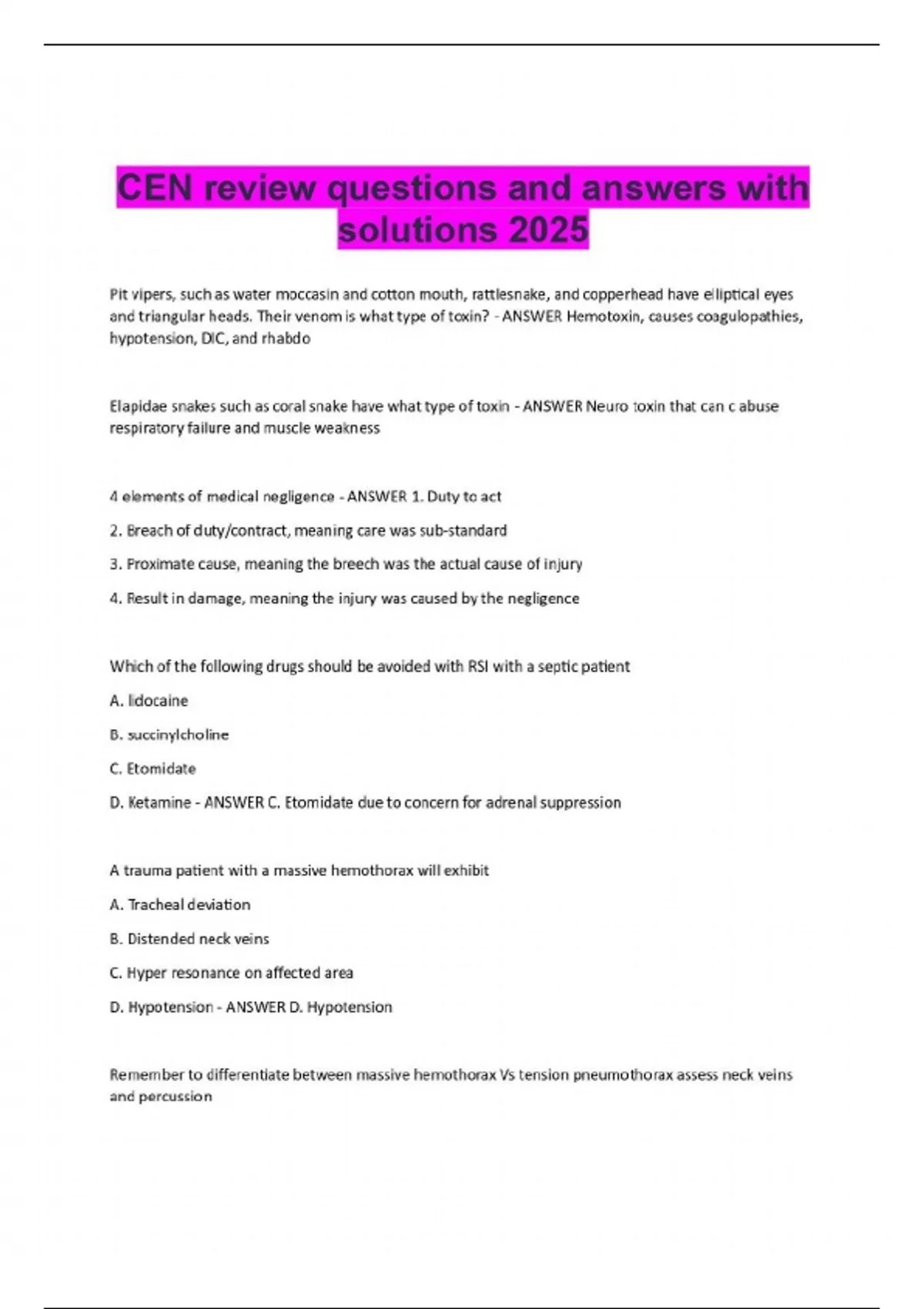 Pit vipers, such as water moccasin and cotton mouth, rattlesnake, and copperhead have elliptical eyes and triangular heads. Their venom is what type of toxin? - ANSWER Hemotoxin, causes coagulopathies, hypotension, DIC, and rhabdo Elapidae snakes such as coral snake have what type of toxin - ANSWER Neuro toxin that can c abuse respiratory failure and muscle weakness 4 elements of medical negligence - ANSWER 1. Duty to act 2. Breach of duty/contract, meaning care was sub-standard 3. Proximate cause, meaning the breech was the actual cause of injury 4. Result in damage, meaning the injury was caused by the negligence Which of the following drugs should be avoided with RSI with a septic patient A. lidocaine B. succinylcholine C. Etomidate D. Ketamine - ANSWER C. Etomidate due to concern for adrenal suppression A trauma patient with a massive hemothorax will exhibit A. Tracheal deviation B. Distended neck veins C. Hyper resonance on affected area D. Hypotension - ANSWER D. Hypotension Remember to differentiate between massive hemothorax Vs tension pneumothorax assess neck veins and percussion