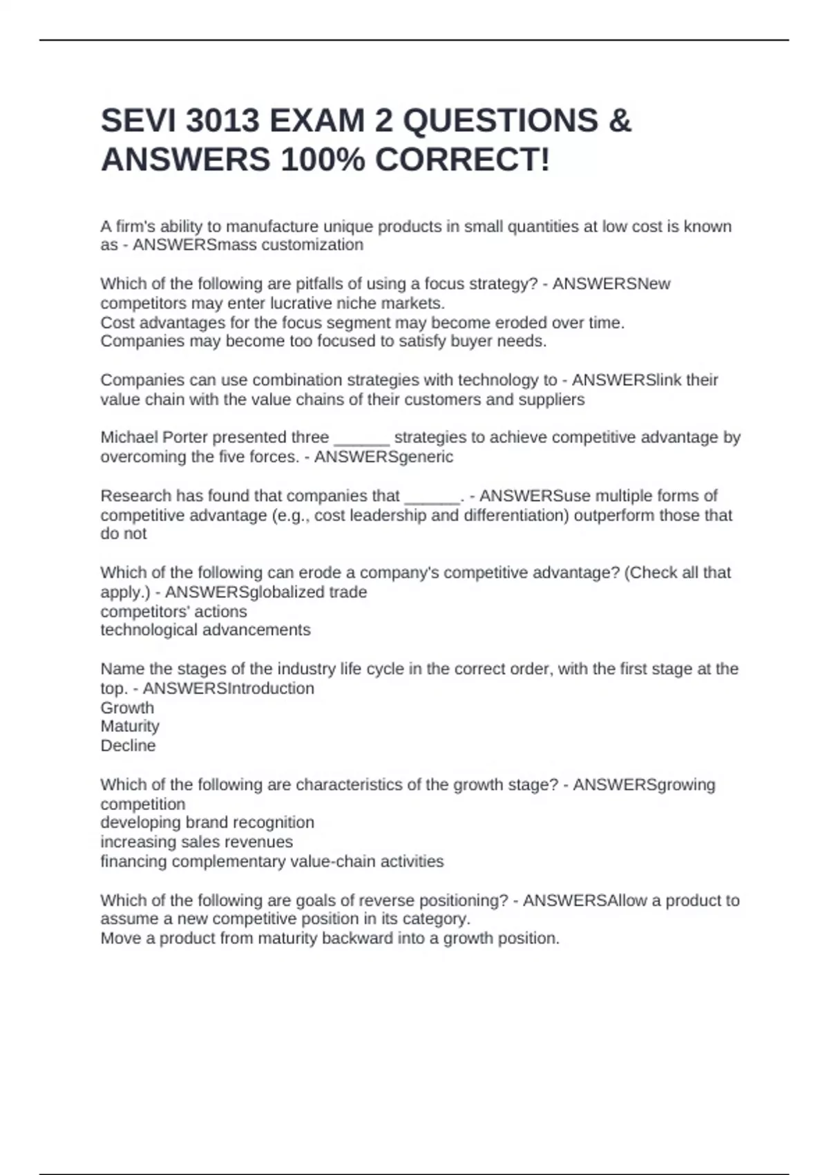 A firm's ability to manufacture unique products in small quantities at low cost is known as - ANSWERSmass customization Which of the following are pitfalls of using a focus strategy? - ANSWERSNew competitors may enter lucrative niche markets. Cost advantages for the focus segment may become eroded over time. Companies may become too focused to satisfy buyer needs. Companies can use combination strategies with technology to - ANSWERSlink their value chain with the value chains of their customers and suppliers Michael Porter presented three ______ strategies to achieve competitive advantage by overcoming the five forces. - ANSWERSgeneric Research has found that companies that ______. - ANSWERSuse multiple forms of competitive advantage (e.g., cost leadership and differentiation) outperform those that do not Which of the following can erode a company's competitive advantage? (Check all that apply.) - ANSWERSglobalized trade competitors' actions technological advancements Name the stages of the industry life cycle in the correct order, with the first stage at the top. - ANSWERSIntroduction Growth