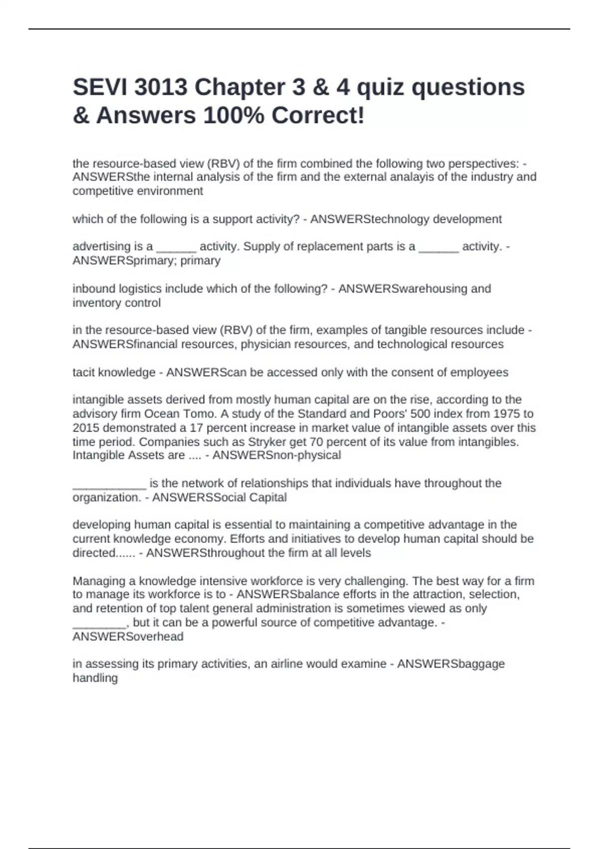 the resource-based view (RBV) of the firm combined the following two perspectives: - ANSWERSthe internal analysis of the firm and the external analayis of the industry and competitive environment which of the following is a support activity? - ANSWERStechnology development advertising is a ______ activity. Supply of replacement parts is a ______ activity. - ANSWERSprimary; primary inbound logistics include which of the following? - ANSWERSwarehousing and inventory control in the resource-based view (RBV) of the firm, examples of tangible resources include - ANSWERSfinancial resources, physician resources, and technological resources tacit knowledge - ANSWERScan be accessed only with the consent of employees intangible assets derived from mostly human capital are on the rise, according to the advisory firm Ocean Tomo. A study of the Standard and Poors' 500 index from 1975 to 2015 demonstrated a 17 percent increase in market value of intangible assets over this time period. Companies such as Stryker get 70 percent of its value from intangibles. Intangible Assets are .... - ANSWERSnon-physical ___________ is the network of relationships that individuals have throughout the organization. - ANSWERSSocial Capital developing human capital is essential to maintaining a competitive advantage in the current knowledge economy. Efforts and initiatives to develop human capital should be directed...... - ANSWERSthroughout the firm at all levels Managing a knowledge intensive workforce is very challenging. The best way for a firm to manage its workforce is to - ANSWERSbalance efforts in the attraction, selection, and retention of top talent general administration is sometimes viewed as only ________, but it can be a powerful source of competitive advantage. - ANSWERSoverhead in assessing its primary activities, an airline would examine - ANSWERSbaggage handling