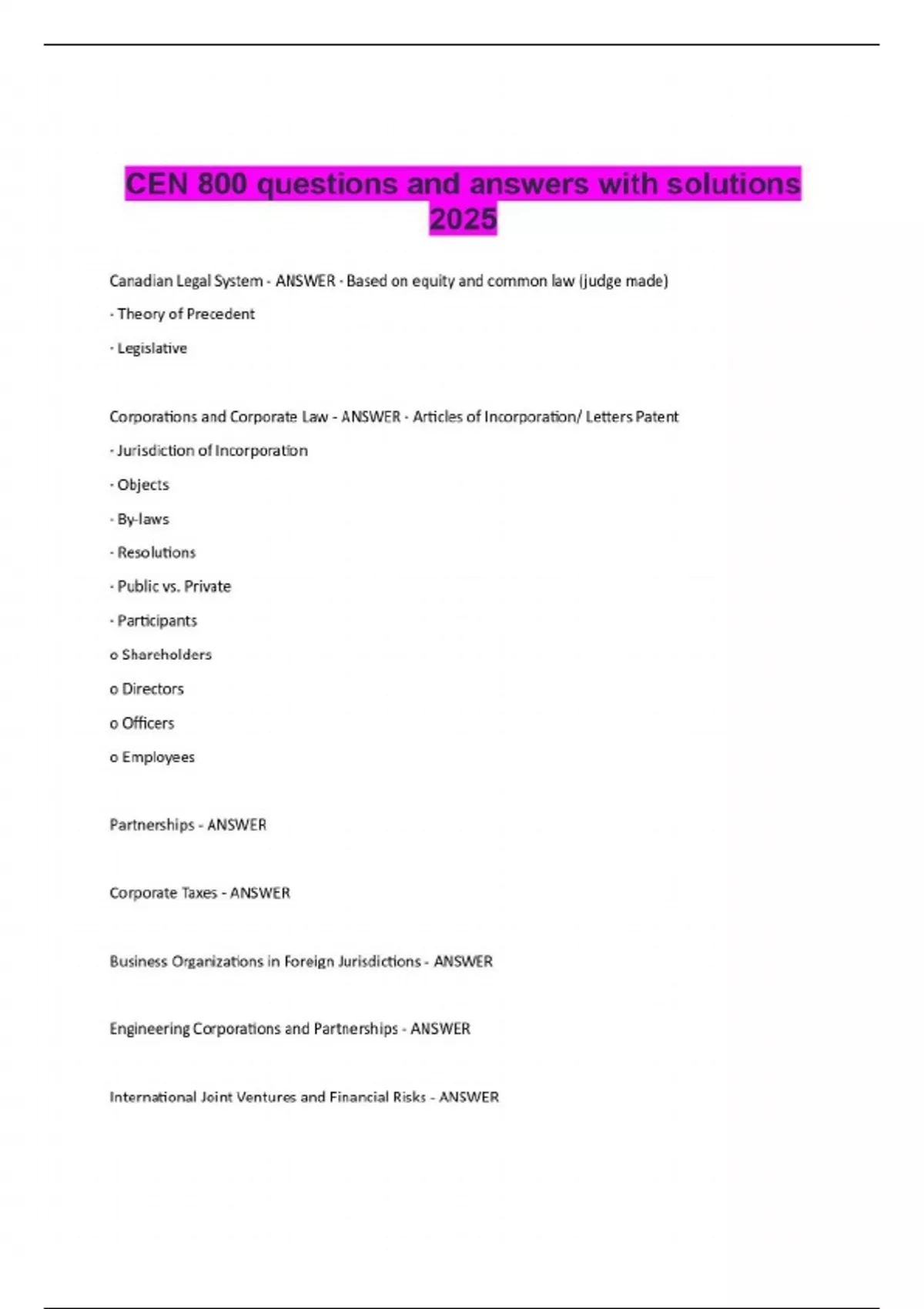 Canadian Legal System - ANSWER · Based on equity and common law (judge made) · Theory of Precedent · Legislative Corporations and Corporate Law - ANSWER · Articles of Incorporation/ Letters Patent · Jurisdiction of Incorporation · Objects · By-laws · Resolutions · Public vs. Private · Participants o Shareholders o Directors o Officers o Employees Partnerships - ANSWER Corporate Taxes - ANSWER Business Organizations in Foreign Jurisdictions - ANSWER Engineering Corporations and Partnerships - ANSWER International Joint Ventures and Financial Risks - ANSWER Parliamentary Supremacy - ANSWER o British North America Act 1867 § Federal Jurisdiction § Provincial Jurisdiction Constitutional Act 1982 and Charter of Rights an
