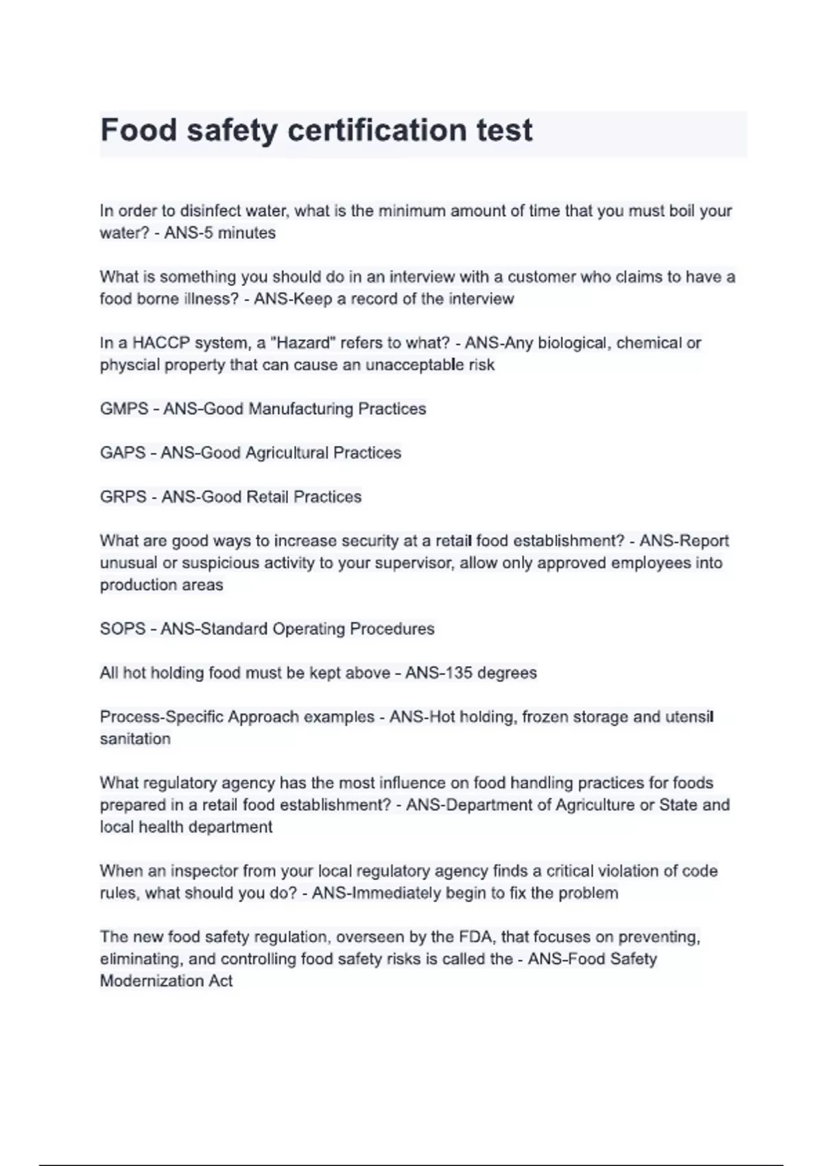 food safety certification test questions and answe