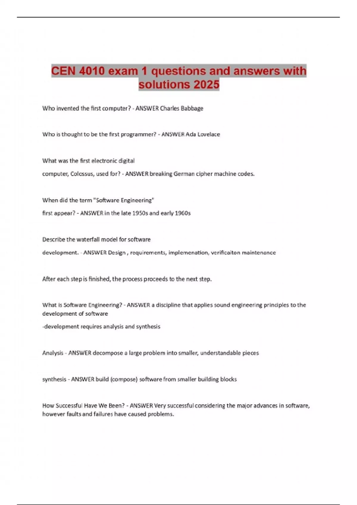 CEN 4010 exam 1 questions and answers with solutions 2025