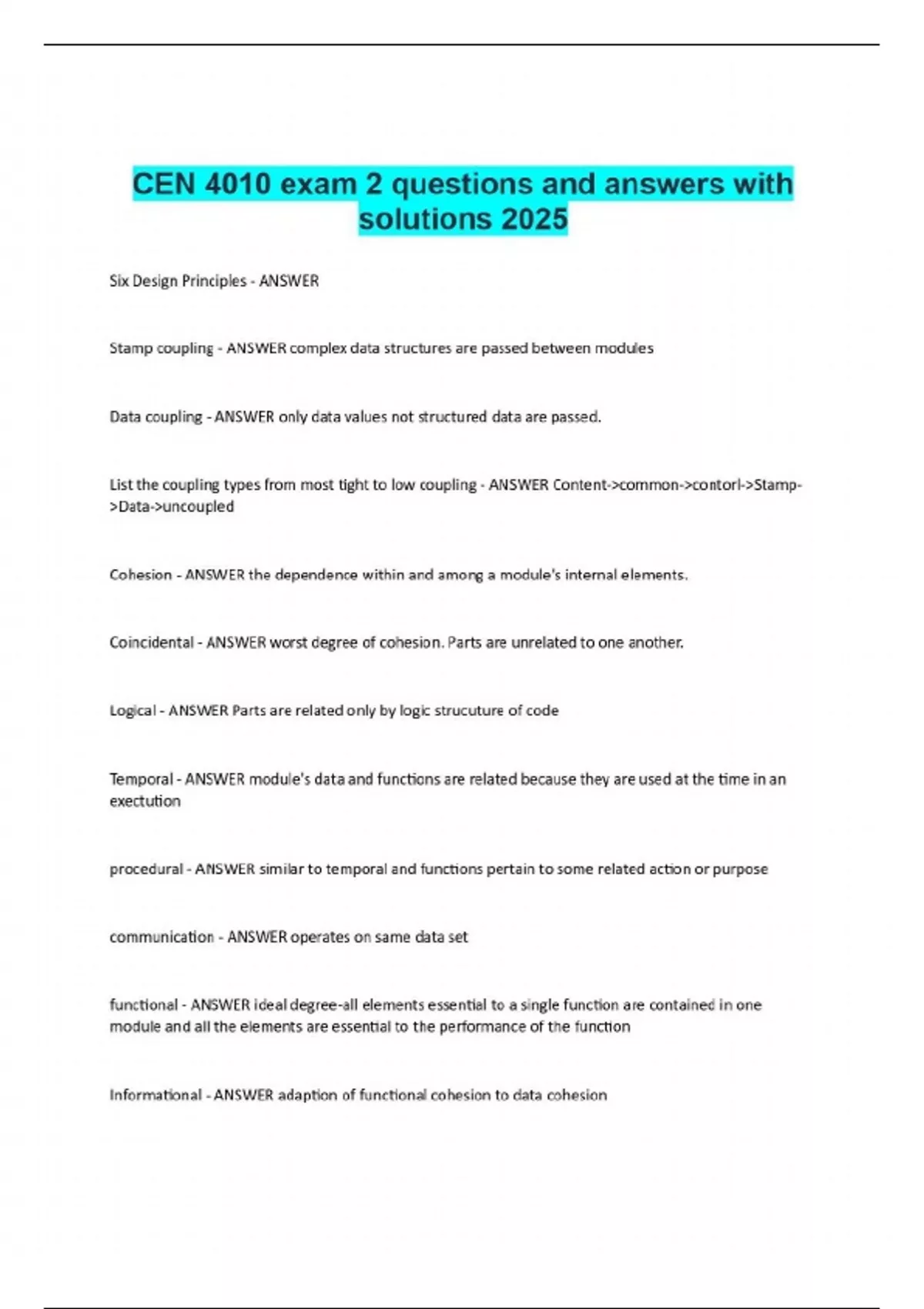 Six Design Principles - ANSWER Stamp coupling - ANSWER complex data structures are passed between modules Data coupling - ANSWER only data values not structured data are passed. List the coupling types from most tight to low coupling - ANSWER Content->common->contorl->Stamp->Data->uncoupled Cohesion - ANSWER the dependence within and among a module's internal elements. Coincidental - ANSWER worst degree of cohesion. Parts are unrelated to one another. Logical - ANSWER Parts are related only by logic strucuture of code Temporal - ANSWER module's data and functions are related because they are used at the time in an exectution procedural - ANSWER similar to temporal and functions pertain to some related action or purpose communication - ANSWER operates on same data set functional - ANSWER ideal degree-all elements essential to a single function are contained in one module and all the elements are essential to the performance of the function Informational - ANSWER adaption of functional cohesion to data cohesion