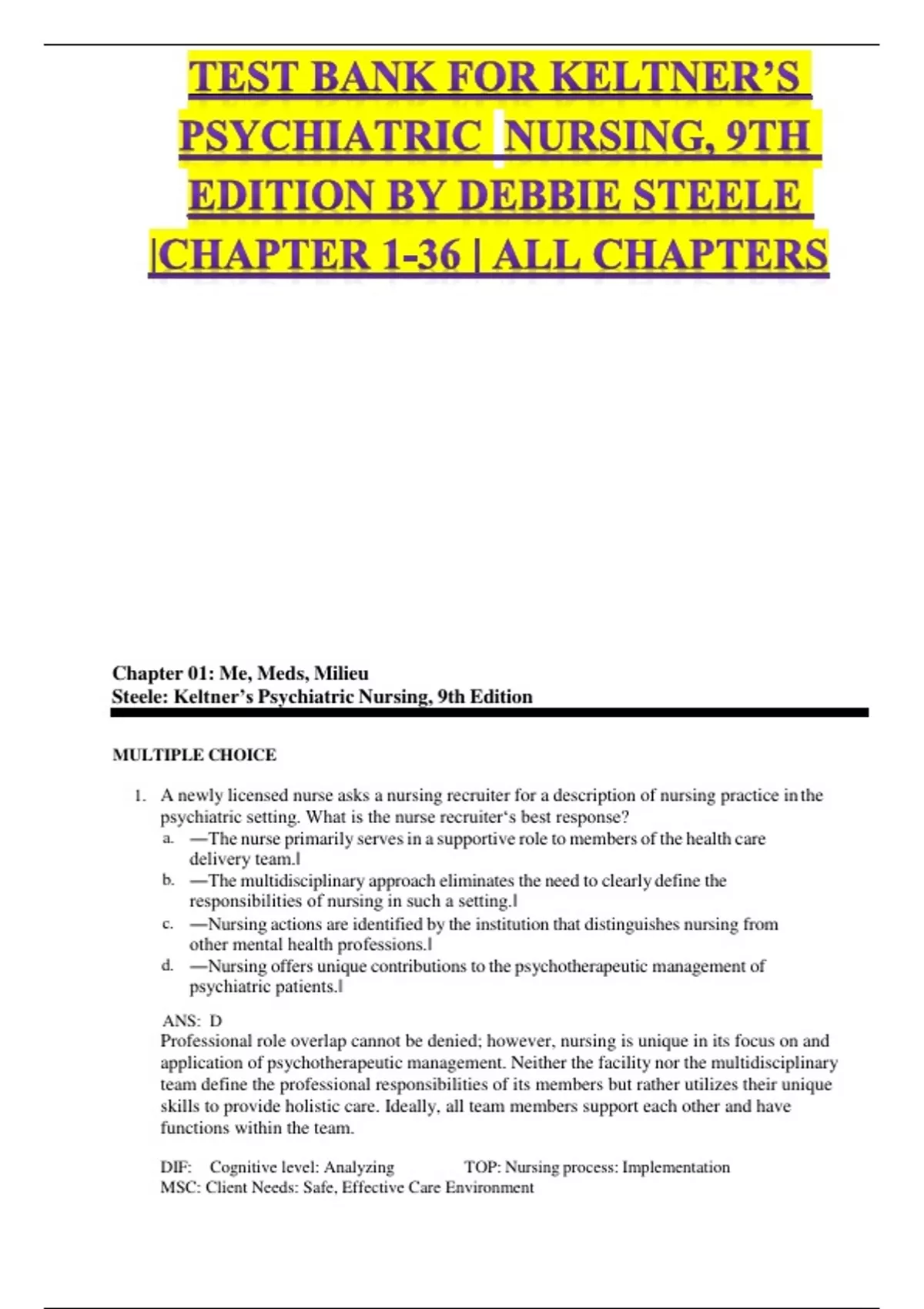 TEST BANK FOR KELTNER’S PSYCHIATRIC NURSING, 9TH EDITION BY DEBBIE STEELE |CHAPTER 1-36 | ALL CHAPTERS Chapter 01: Me, Meds, Milieu Steele: Keltner’s Psychiatric Nursing, 9th Edition MULTIPLE CHOICE 1. A newly licensed nurse asks a nursing recruiter for a description of nursing practice in the psychiatric setting. What is the nurse recruiter‘s best response? a. ―The nurse primarily serves in a supportive role to members of the health care delivery team.‖ b. ―The multidisciplinary approach eliminates the need to clearly define the responsibilities of nursing in such a setting.‖ c. ―Nursing actions are identified by the institution that distinguishes nursing from other mental health professions.‖ d. ―Nursing offers unique contributions to the psychotherapeutic management of psychiatric patients.‖ ANS: D Professional role overlap cannot be denied; however, nursing is unique in its focus on and application of psychotherapeutic management. Neither the facility nor the multidisciplinary team define the professional responsibilities of its members but rather utilizes their unique skills to provide holistic care. Ideally, all team members support each other and have functions within the team. DIF: Cognitive level: Analyzing TOP: Nursing process: Implementation MSC: Client Needs: Safe, Effective Care Environment