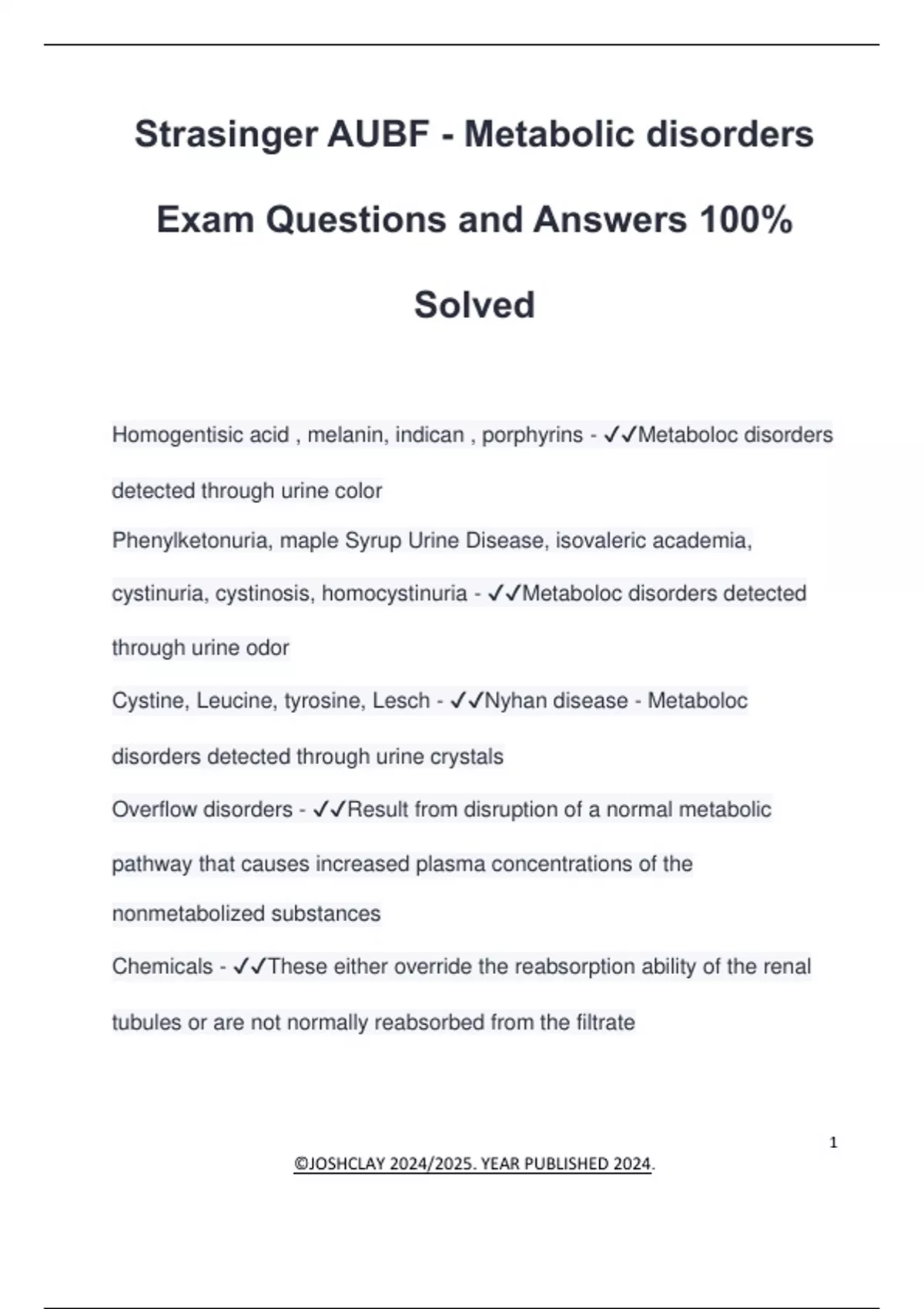 Strasinger AUBF - Metabolic disorders Exam Questions and Answers 100% Solved Homogentisic acid , melanin, indican , porphyrins - Metaboloc disorders detected through urine color Phenylketonuria, maple Syrup Urine Disease, isovaleric academia, cystinuria, cystinosis, homocystinuria - Metaboloc disorders detected through urine odor Cystine, Leucine, tyrosine, Lesch - Nyhan disease - Metaboloc disorders detected through urine crystals Overflow disorders - Result from disruption of a normal metabolic pathway that causes increased plasma concentrations of the nonmetabolized substances Chemicals - These either override the reabsorption ability of the renal tubules or are not normally reabsorbed from the filtrate