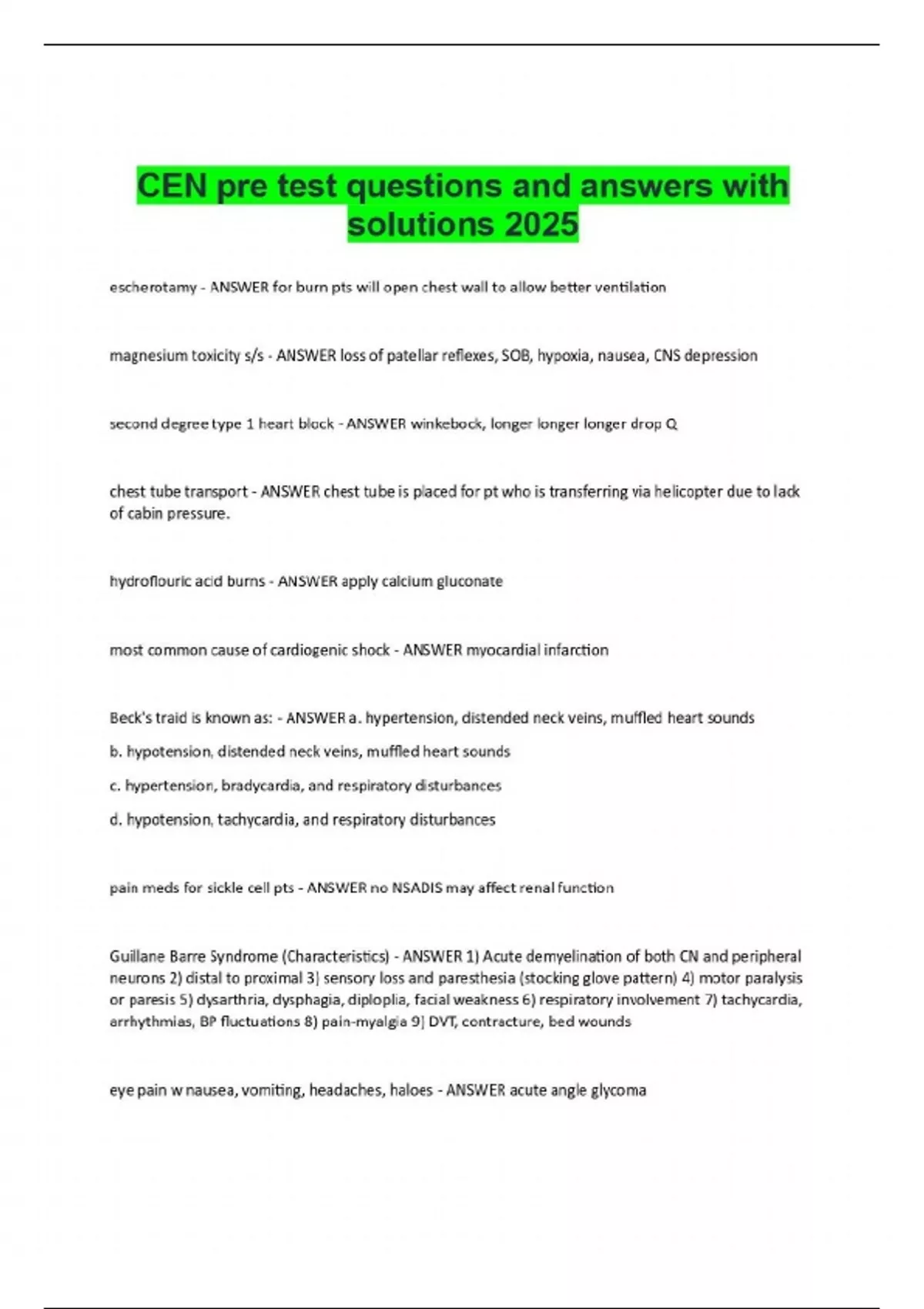 escherotamy - ANSWER for burn pts will open chest wall to allow better ventilation magnesium toxicity s/s - ANSWER loss of patellar reflexes, SOB, hypoxia, nausea, CNS depression second degree type 1 heart block - ANSWER winkebock, longer longer longer drop Q chest tube transport - ANSWER chest tube is placed for pt who is transferring via helicopter due to lack of cabin pressure. hydroflouric acid burns - ANSWER apply calcium gluconate most common cause of cardiogenic shock - ANSWER myocardial infarction Beck's traid is known as: - ANSWER a. hypertension, distended neck veins, muffled heart sounds b. hypotension, distended neck veins, muffled heart sounds c. hypertension, bradycardia, and respiratory disturbances d. hypotension, tachycardia, and respiratory disturbances pain meds for sickle cell pts - ANSWER no NSADIS may affect renal function Guillane Barre Syndrome (Characteristics) - ANSWER 1) Acute demyelination of both CN and peripheral neurons 2) distal to proximal 3) sensory loss and paresthesia (stocking glove pattern) 4) motor paralysis or paresis 5) dysarthria, dysphagia, diploplia, facial weakness 6) respiratory involvement 7) tachycardia, arrhythmias, BP fluctuations 8) pain-myalgia 9) DVT, contracture, bed wounds eye pain w nausea, vomiting, headaches, haloes - ANSWER acute angle glycoma