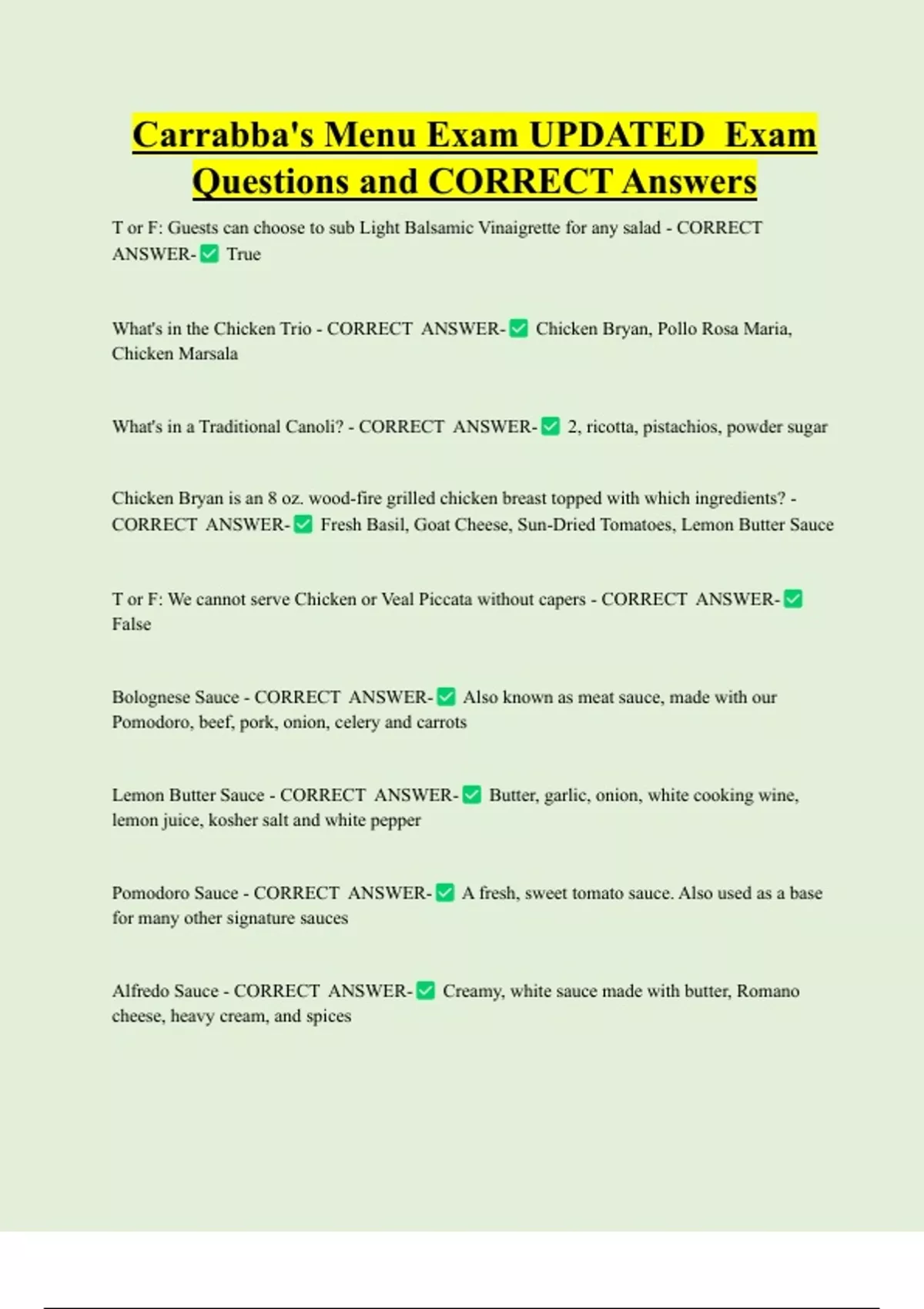 Carrabba's Menu Exam UPDATED Exam Questions and CORRECT Answers