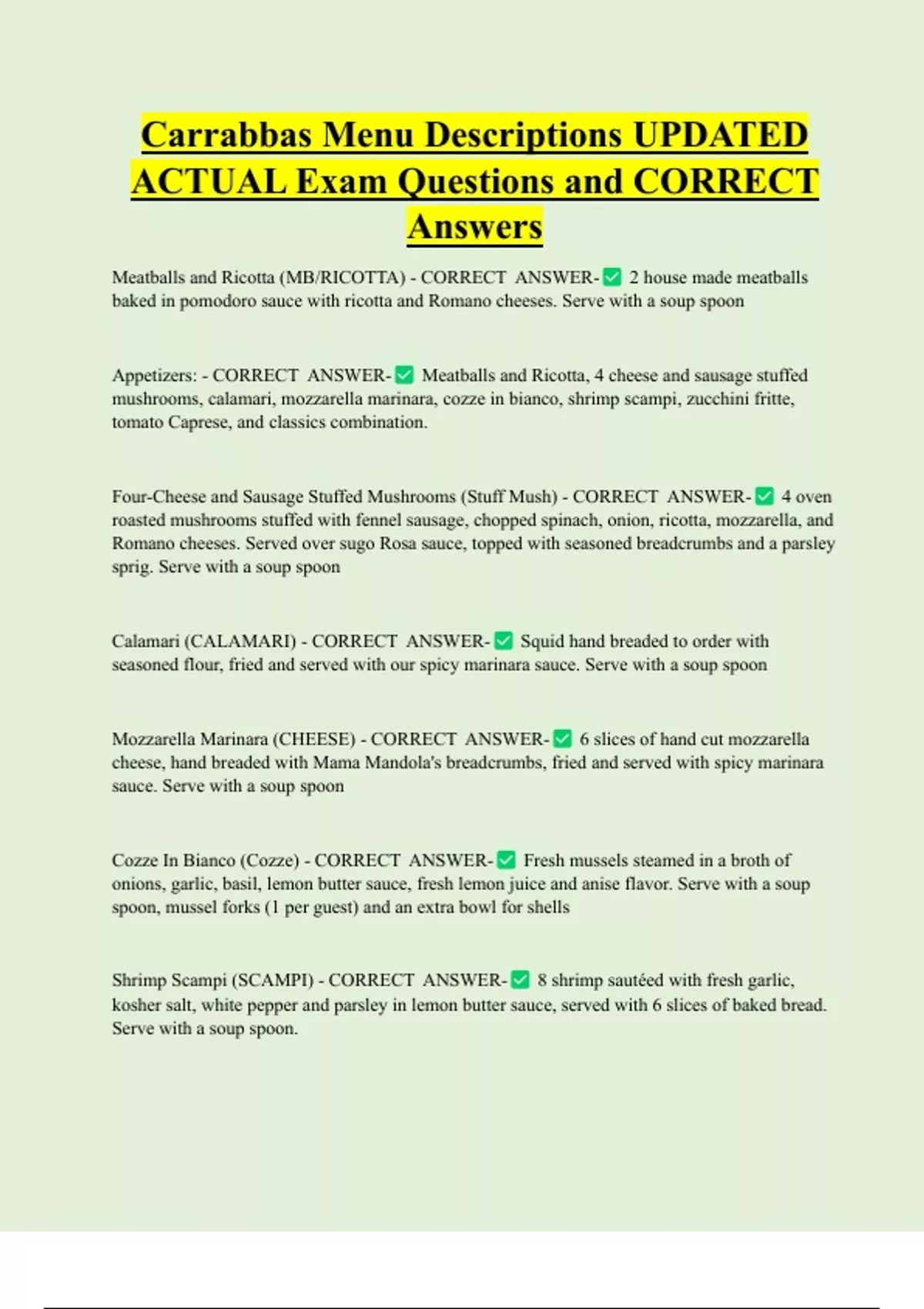 Carrabbas Menu Descriptions UPDATED ACTUAL Exam Questions and CORRECT Answers Meatballs and Ricotta (MB/RICOTTA) - CORRECT ANSWER- 2 house made meatballs baked in pomodoro sauce with ricotta and Romano cheeses. Serve with a soup spoon Appetizers: - CORRECT ANSWER- Meatballs and Ricotta, 4 cheese and sausage stuffed mushrooms, calamari, mozzarella marinara, cozze in bianco, shrimp scampi, zucchini fritte, tomato Caprese, and classics combination