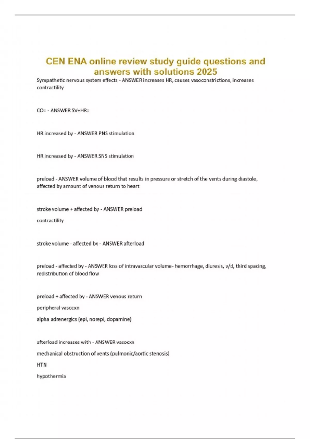 Sympathetic nervous system effects - ANSWER increases HR, causes vasoconstrictions, increases contractility CO= - ANSWER SV+HR= HR increased by - ANSWER PNS stimulation HR increased by - ANSWER SNS stimulation preload - ANSWER volume of blood that results in pressure or stretch of the vents during diastole, affected by amount of venous return to heart stroke volume + affected by - ANSWER preload contractility stroke volume - affected by - ANSWER afterload preload - affected by - ANSWER loss of intravascular volume- hemorrhage, diuresis, v/d, third spacing, redistribution of blood flow preload + affected by - ANSWER venous return peripheral vasocxn alpha adrenergics (epi, norepi, dopamine) afterload increases with - ANSWER vasocxn mechanical obstruction of vents (pulmonic/aortic stenosis) HTN hypothermia shock compensatory mechanisms