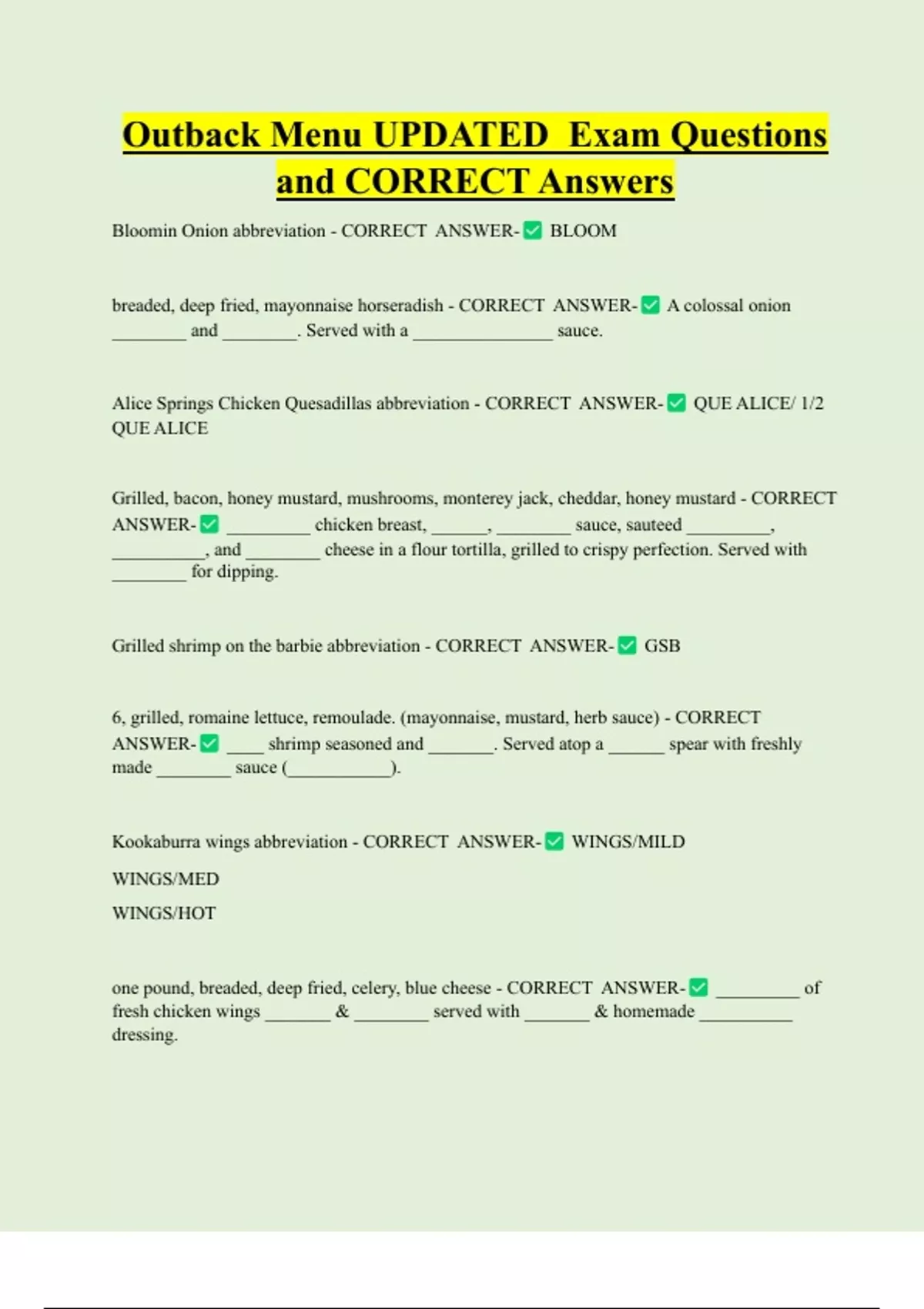 Outback Menu UPDATED Exam Questions and CORRECT Answers
