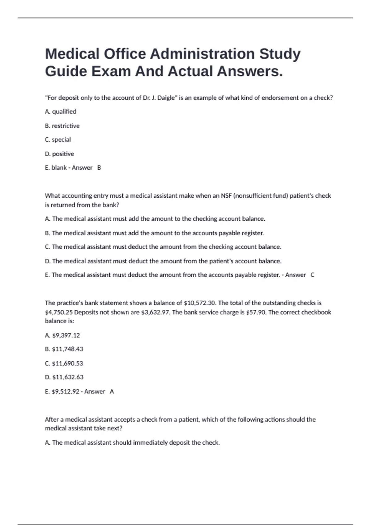 E. The medical assistant should place the check in the cash drawer. - Answer C