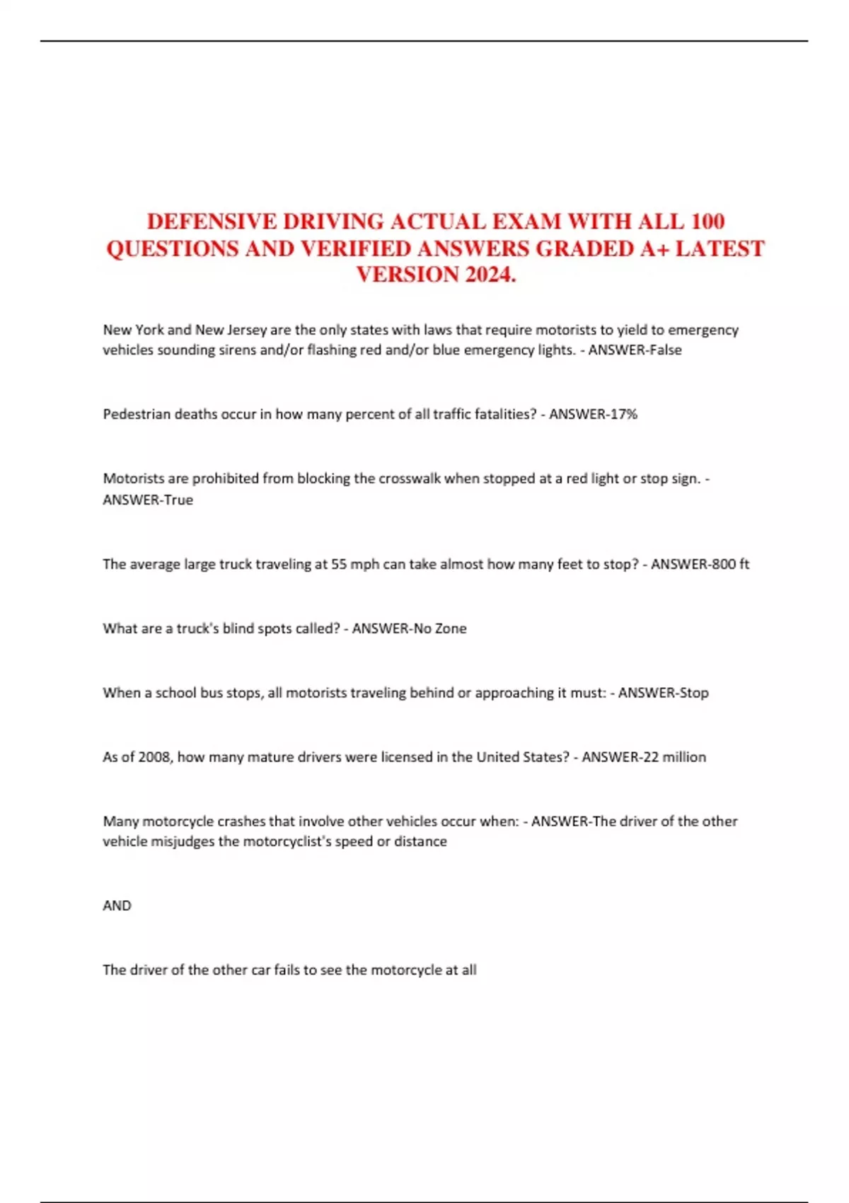 DEFENSIVE DRIVING ACTUAL EXAM WITH ALL 100 QUESTIONS AND VERIFIED ANSWERS GRADED A+ LATEST VERSION 2024.