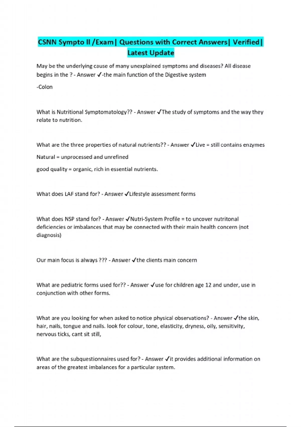 CSNN Sympto ll /Exam| Questions with Correct Answers| Verified| Latest Update