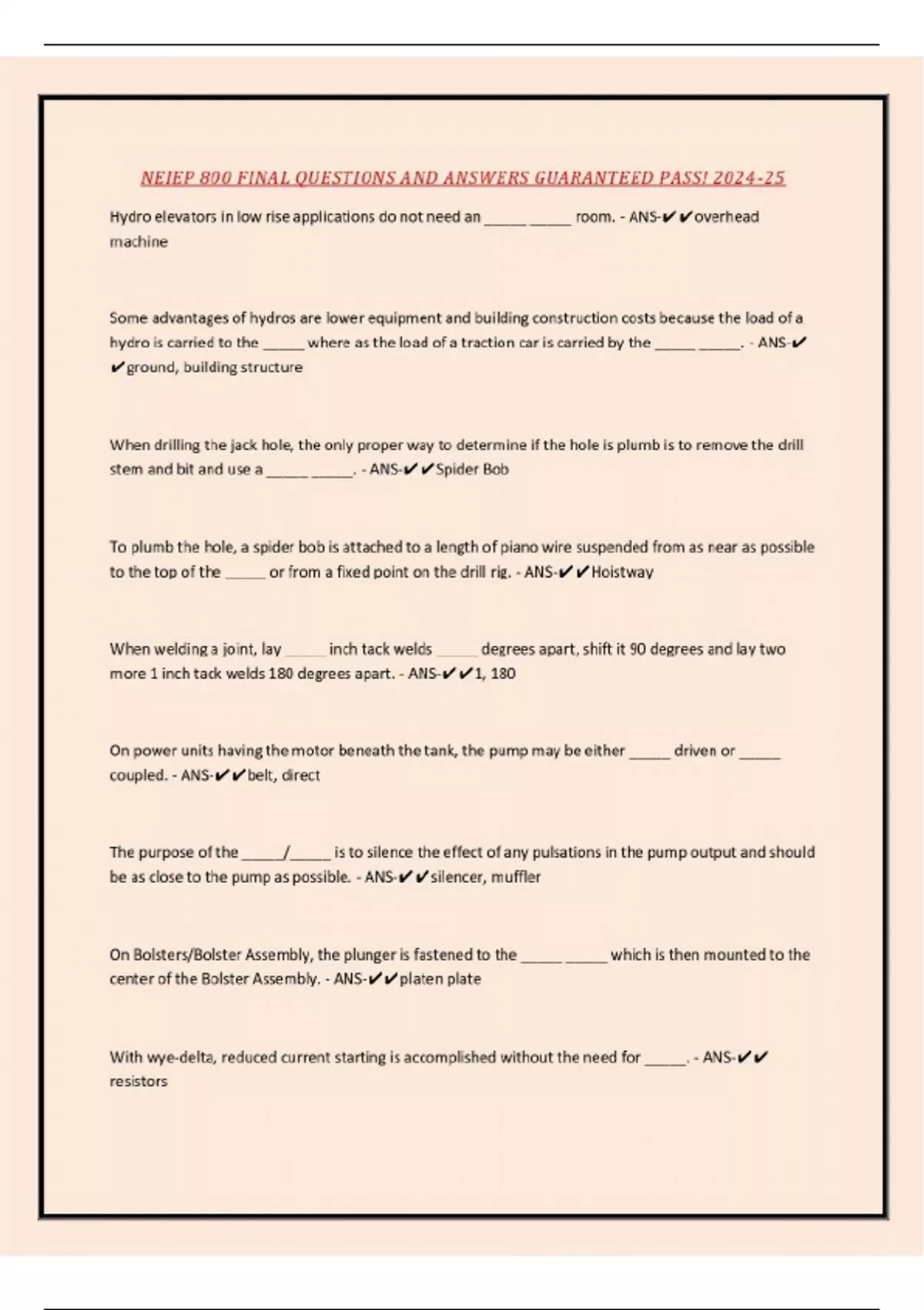 NEIEP 800 FINAL QUESTIONS AND ANSWERS GUARANTEED PASS! 2024-25 Hydro elevators in low rise applications do not need an _____ _____ room. - ANS-overhead machine Some advantages of hydros are lower equipment and building construction costs because the load of a hydro is carried to the _____ where as the load of a traction car is carried by the _____ _____. - ANS- ground, building structure When drilling the jack hole, the only proper way to determine if the hole is plumb is to remove the drill stem and bit and use a _____ _____. - ANS-Spider Bob To plumb the hole, a spider bob is attached to a length of piano wire suspended from as near as possible to the top of the _____ or from a fixed point on the drill rig. - ANS-Hoistway When welding a joint, lay _____ inch tack welds _____ degrees apart, shift it 90 degrees and lay two more 1 inch tack welds 180 degrees apart. - ANS-1, 180 On power units having the motor beneath the tank, the pump may be either _____ driven or _____ coupled. - ANS-belt, direct The purpose of the _____/_____ is to silence the effect of any pulsations in the pump output and should be as close to the pump as possible. - A