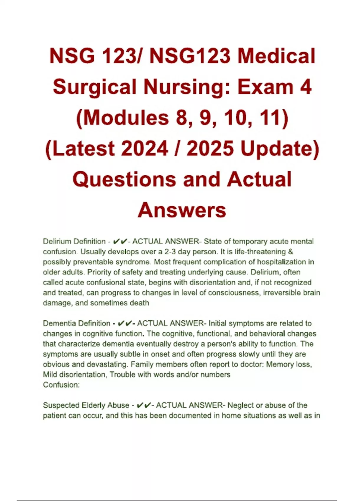 NSG 123/ NSG123 Medical Surgical Nursing: Exam 4 (Modules 8, 9, 10, 11) (Latest 2024 / 2025 Update) Questions and Actual Answers