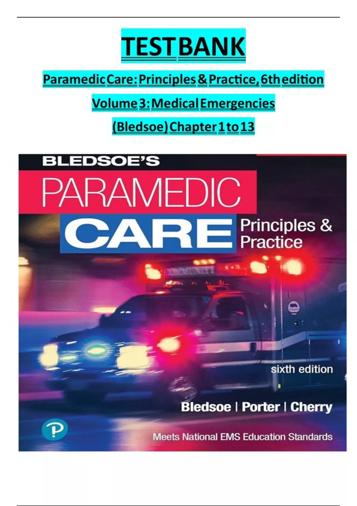 Test Bank - Paramedic Care: Principles & Practice, Volume 3, 5th edition by Bryan E. Bledsoe, (All Chapters Included).A strong, evidence-based foundation in the principles and practices of modern EMS Paramedic Care: Principles & Practice, Fifth Edition, offers EMS students and professionals a foundational guide and reference to paramedicine. Developed to stay ahead of current trends and practices, all five volumes are based on the National EMS Education Standards and the accompanying Paramedic Instructional Guidelines. Volume 3, Medical Emergencies,covers medical emergencies and includes updated material that is consistent with the 2015 American Heart Association Guidelines for Cardiopulmonary Resuscitation and Emergency Cardiovascular Care. New information is included on Ebola, Zika, and Chikunyaga virus disease, as well as updated toxic syndromes and drugs of abuse tables, and a new section on cardiac arrest in pregnancy. Also available with MyBRADYLab™ This title is also available with MyBRADYLab―an online homework, tutorial, and assessment program designed to work with this text to engage students and improve results. Within its structured environment, students practice what they learn, test their understanding, and pursue a personalized study plan that helps them better absorb course material and understand difficult concept
