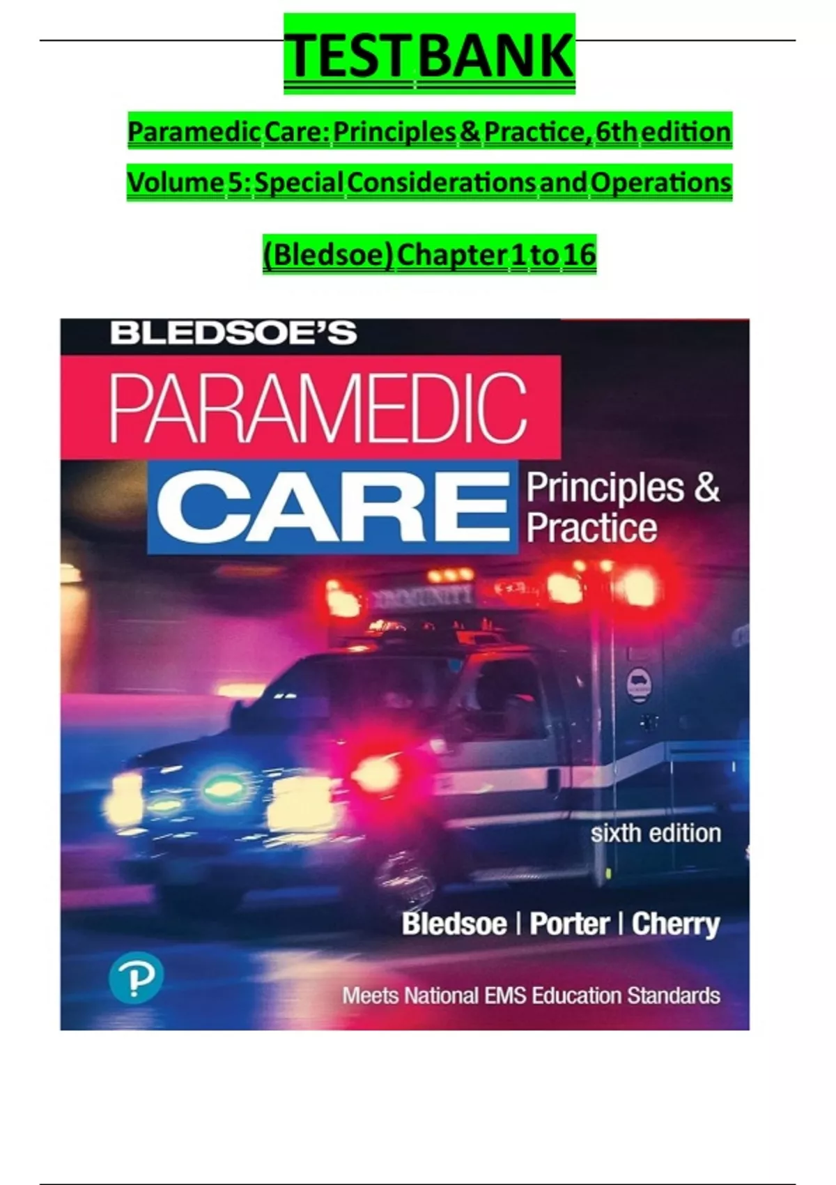 TEST BANK For PARAMEDIC CARE: Principles & Practice 5th Edition By BLEDSOE Volume 5: Special Considerations and Operation || Updated Version 2024 A+ A strong, evidence-based foundation in the principles and practices of modern EMS Paramedic Care: Principles & Practice, Fifth Edition, offers EMS students and professionals a foundational guide and reference to paramedicine. Developed to stay ahead of current trends and practices, all five volumes are based on the National EMS Education Standards and the accompanying Paramedic Instructional Guidelines. Volume 5, Special Considerations/Operations, provides paramedic students with information they need about special populations and paramedic operations. The first eight chapters discuss medical emergencies involving special patient populations: gynecology, obstetrics, neonatology, pediatrics, geriatrics, abused/neglected/assaulted patients, patients with special challenges, and patients who require chronic care. The next eight chapters examine special circumstances that the paramedic may face at any time, including multiple-casualty incidents, rescue operations, hazardous materials, crime scenes, rural practice, and terrorist incidents. Also available with MyBRADYLab™ This title is also available with MyBRADYLab―an online homework, tutorial, and assessment program designed to work with this text to engage students and improve results. Within its structured environment, students practice what they learn, test their understanding, and pursue a personalized study plan that helps them better absorb course material and understand difficult concepts. Note: You are purchasing a standalone product; MyBRADYLab does not come packaged with this content. Students, if interested in purchasing this title with MyBRADYLab, ask your instructor for the correct package ISBN and Course ID. Instructors, contact your Pearson representative for more information.