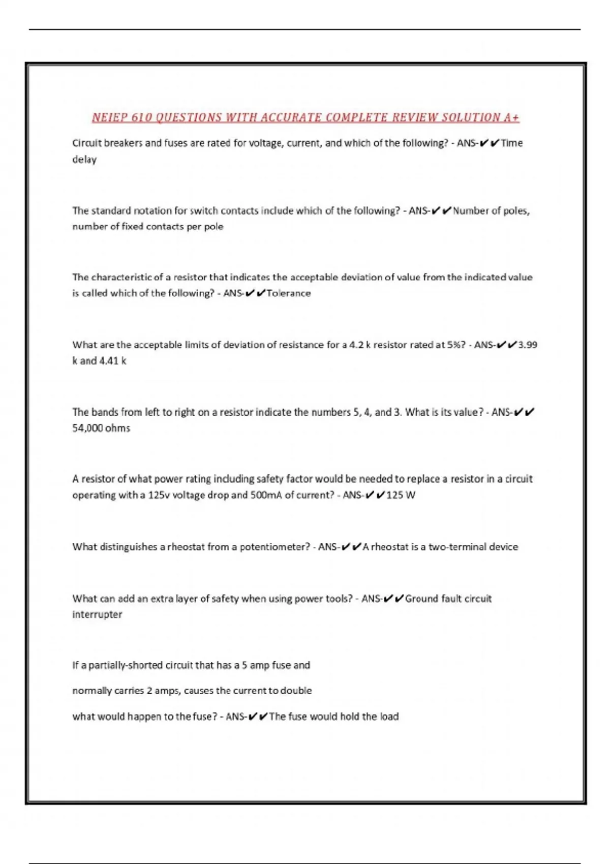 NEIEP 610 QUESTIONS WITH ACCURATE COMPLETE REVIEW SOLUTION A+ Circuit breakers and fuses are rated for voltage, current, and which of the following? - ANS-Time delay The standard notation for switch contacts include which of the following? - ANS-Number of poles, number of fixed contacts per pole The characteristic of a resistor that indicates the acceptable deviation of value from the indicated value is called which of the following? - ANS-Tolerance What are the acceptable limits of deviation of resistance for a 4.2 k resistor rated at 5%? - ANS-3.99 k and 4.41 k The bands from left to right on a resistor indicate the numbers 5, 4, and 3. What is its value? - ANS- 54,000 ohms A resistor of what power rating including safety factor would be needed to replace a resistor in a circuit operating with a 125v voltage drop and 500mA of current? - ANS-125 W What distinguishes a rheostat from a potentiometer? - ANS...