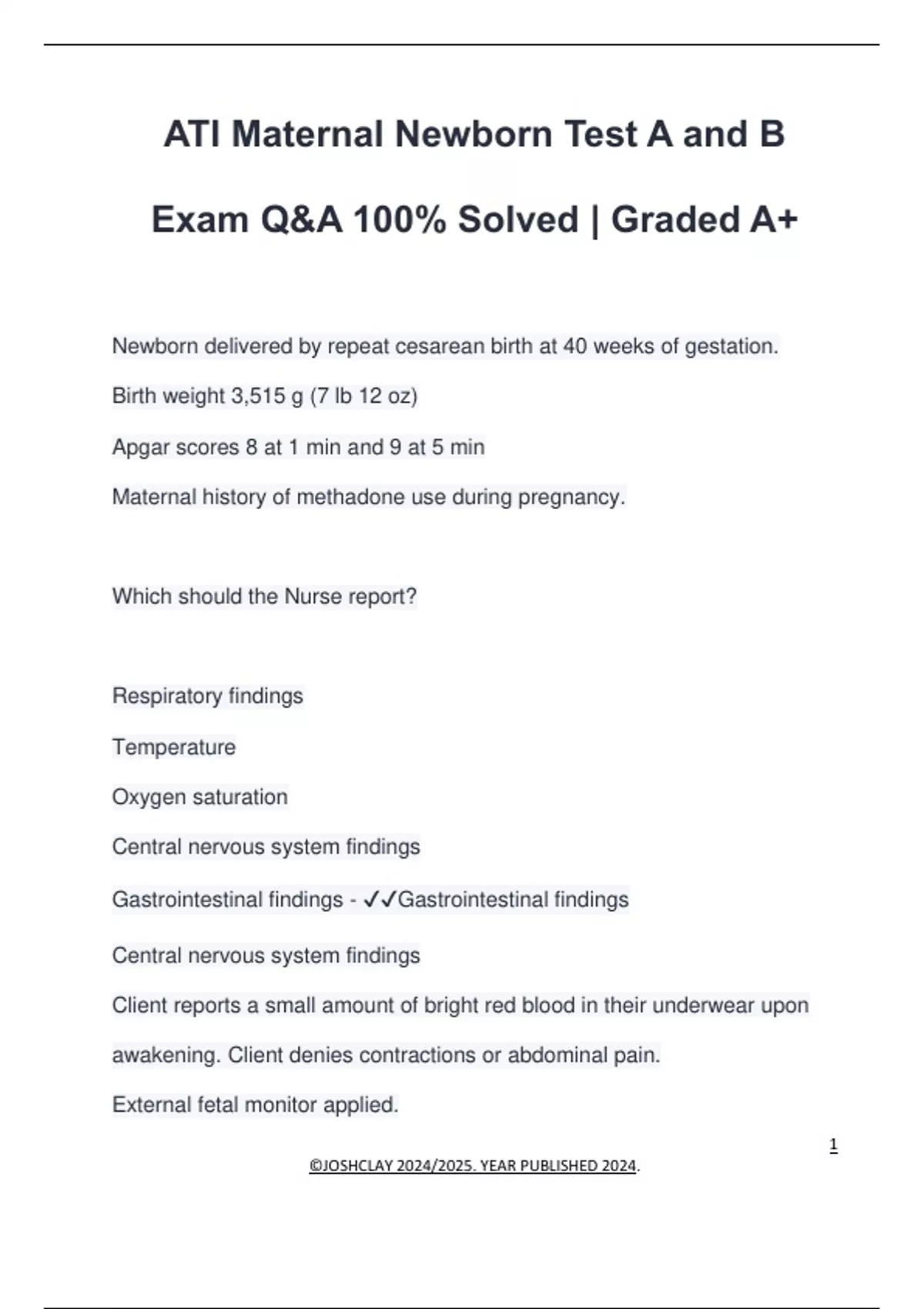 ATI Maternal Newborn Test A and B Exam Q&A 100% Solved | Graded A+ Newborn delivered by repeat cesarean birth at 40 weeks of gestation. Birth weight 3,515 g (7 lb 12 oz) Apgar scores 8 at 1 min and 9 at 5 min Maternal history of methadone use during pregnancy. Which should the Nurse report? Respiratory findings Temperature Oxygen saturation Central nervous system findings Gastrointestinal findings - Gastrointestinal findings Central nervous system findings Client reports a small amount of bright red blood in their underwear upon awakening. Client denies contractions or abdominal pain. External fetal monitor applied.