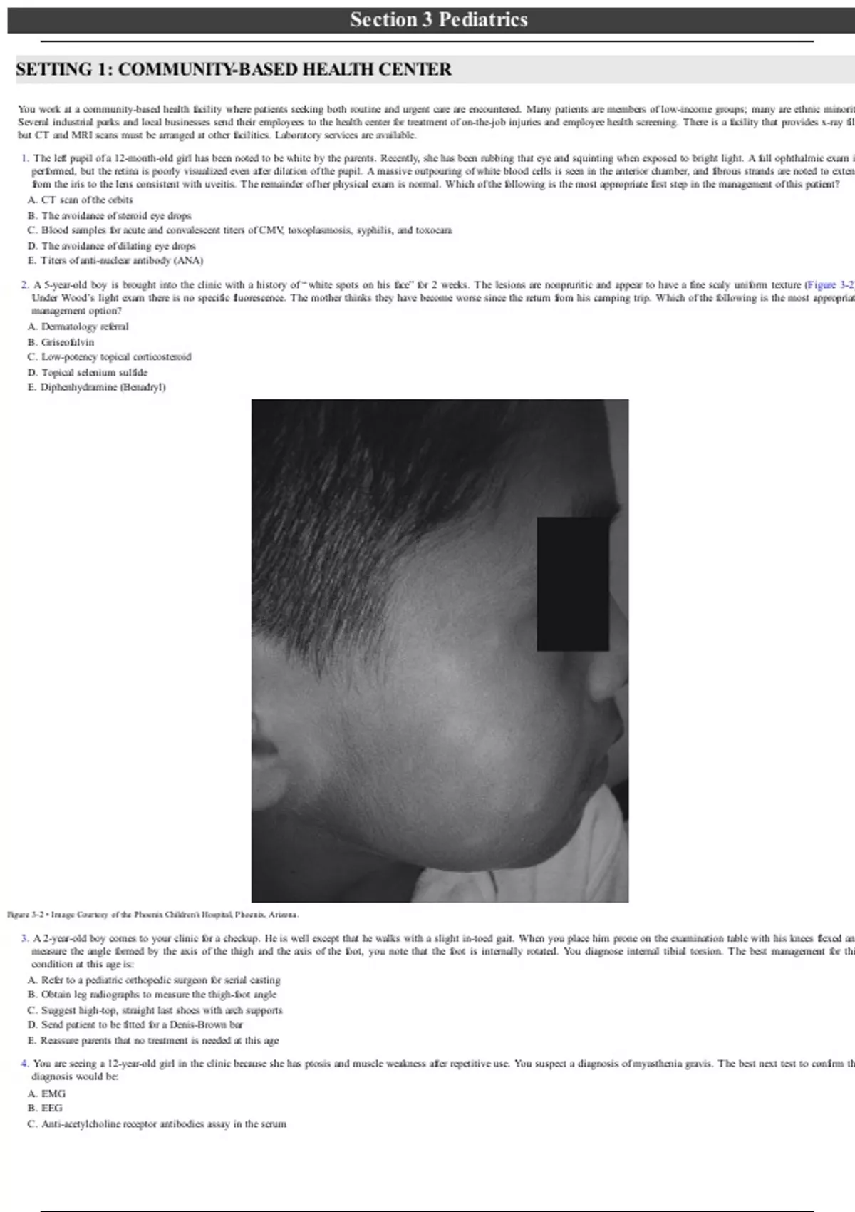 1. The left pupil of a 12-month-old girl has been noted to be white by the parents. Recently, she has been rubbing that eye and squinting when exposed to bright light. A full ophthalmic exam i