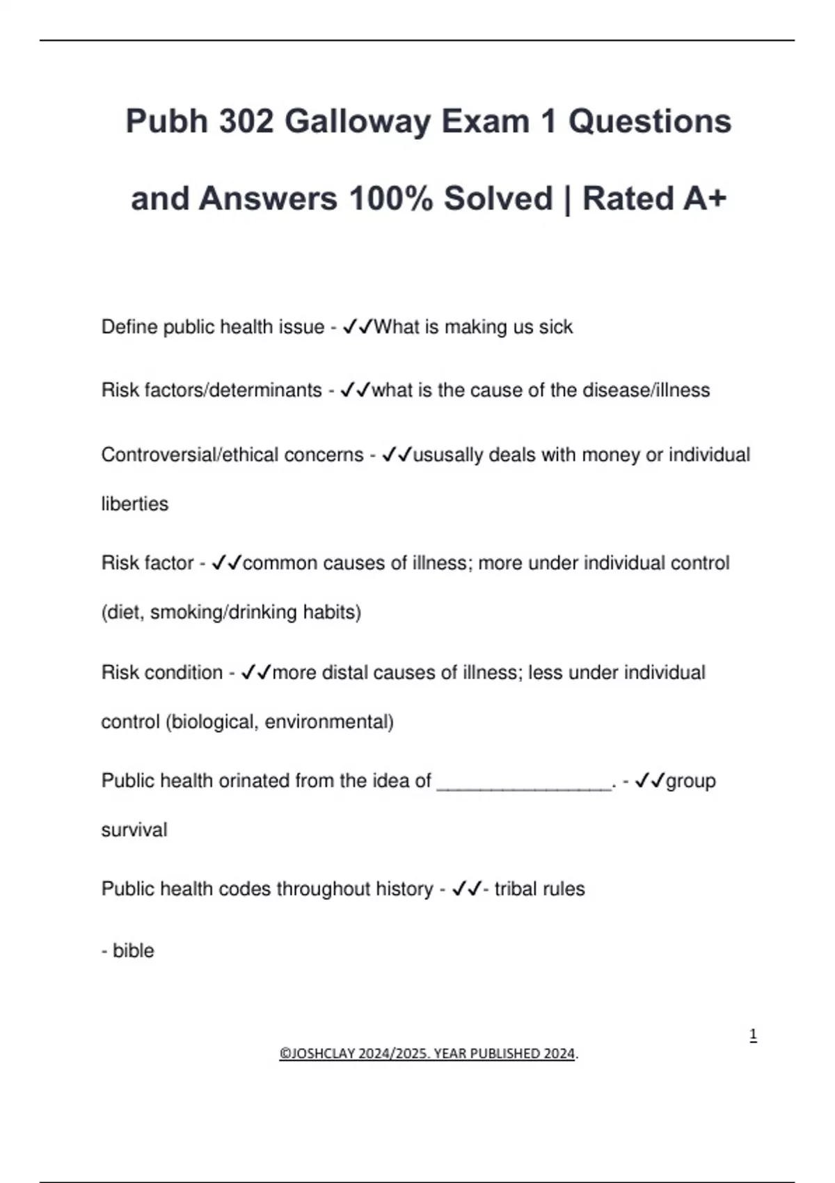 Pubh 302 Galloway Exam 1 Questions and Answers 100% Solved | Rated A+ Define public health issue - What is making us sick Risk factors/determinants - what is the cause of the disease/illness Controversial/ethical concerns - ususally deals with money or individual liberties Risk factor - common causes of illness; more under individual control (diet, smoking/drinking habits) Risk condition - more distal causes of illness; less under individual control (biological, environmental) Public health orinated from the idea of ________________. - group survival Public health codes throughout history - - tribal rules - bible