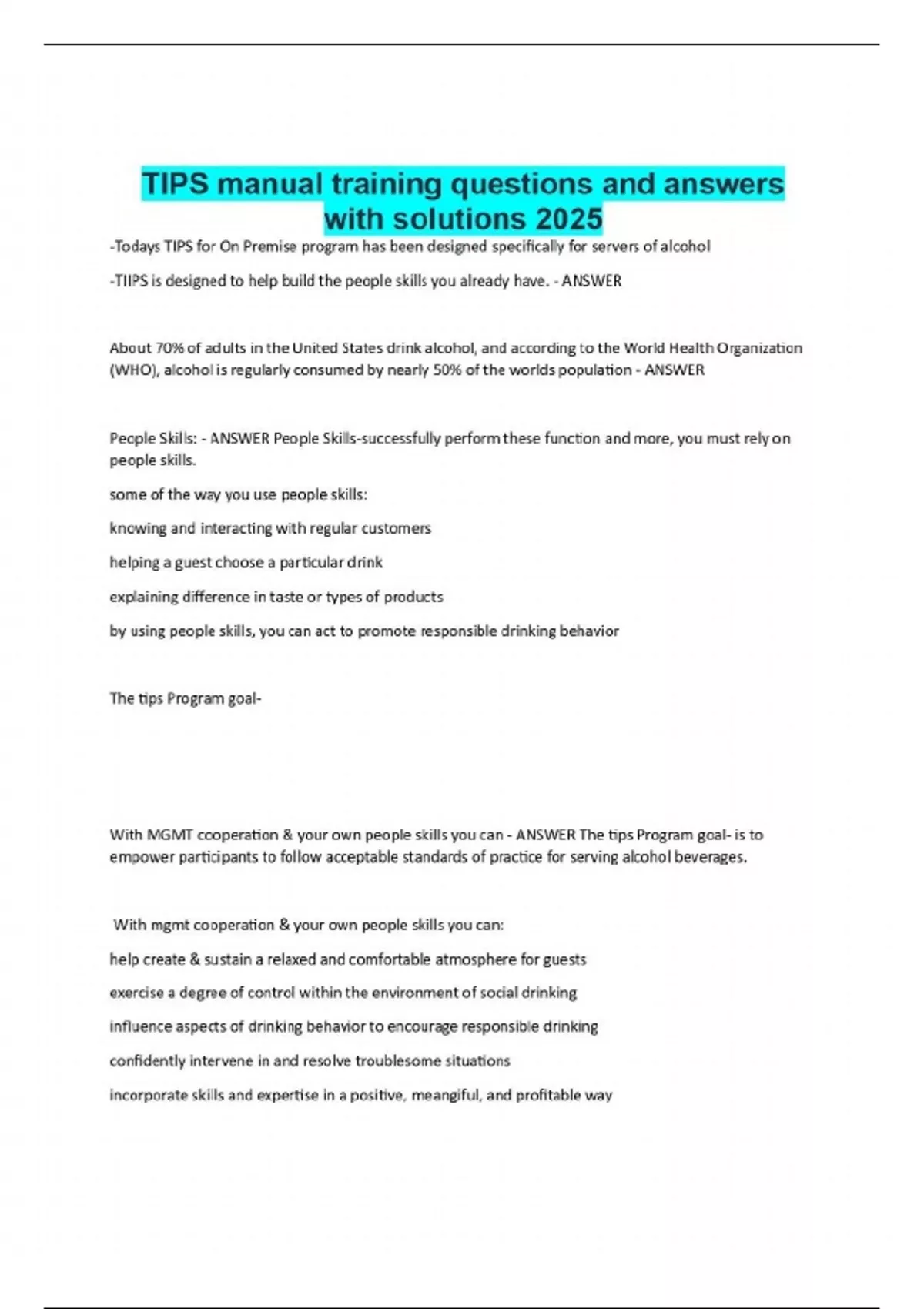 -Todays TIPS for On Premise program has been designed specifically for servers of alcohol -TIIPS is designed to help build the people skills you already have. - ANSWER About 70% of adults in the United States drink alcohol, and according to the World Health Organization (WHO), alcohol is regularly consumed by nearly 50% of the worlds population - ANSWER People Skills: - ANSWER People Skills-successfully perform these function and more, you must rely on people skills. some of the way you use people skills: knowing and interacting with regular customers helping a guest choose a particular drink explaining difference in taste or types of products by using people skills, you can act to promote responsible drinking behavior The tips Program goal- With MGMT cooperation & your own people skills you can - ANSWER The tips Program goal- is to empower participants to follow acceptable standards of practice for serving alcohol beverages. With mgmt cooperation & your own people skills you can: help create & sustain a relaxed and comfortable atmosphere for guests exercise a degree of control within the environment of social drinking influence aspects of drinking behavior to encourage responsible drinking confidently intervene in and resolve troublesome situations incorporate skills and expertise in a positive, meangiful, and profitable way