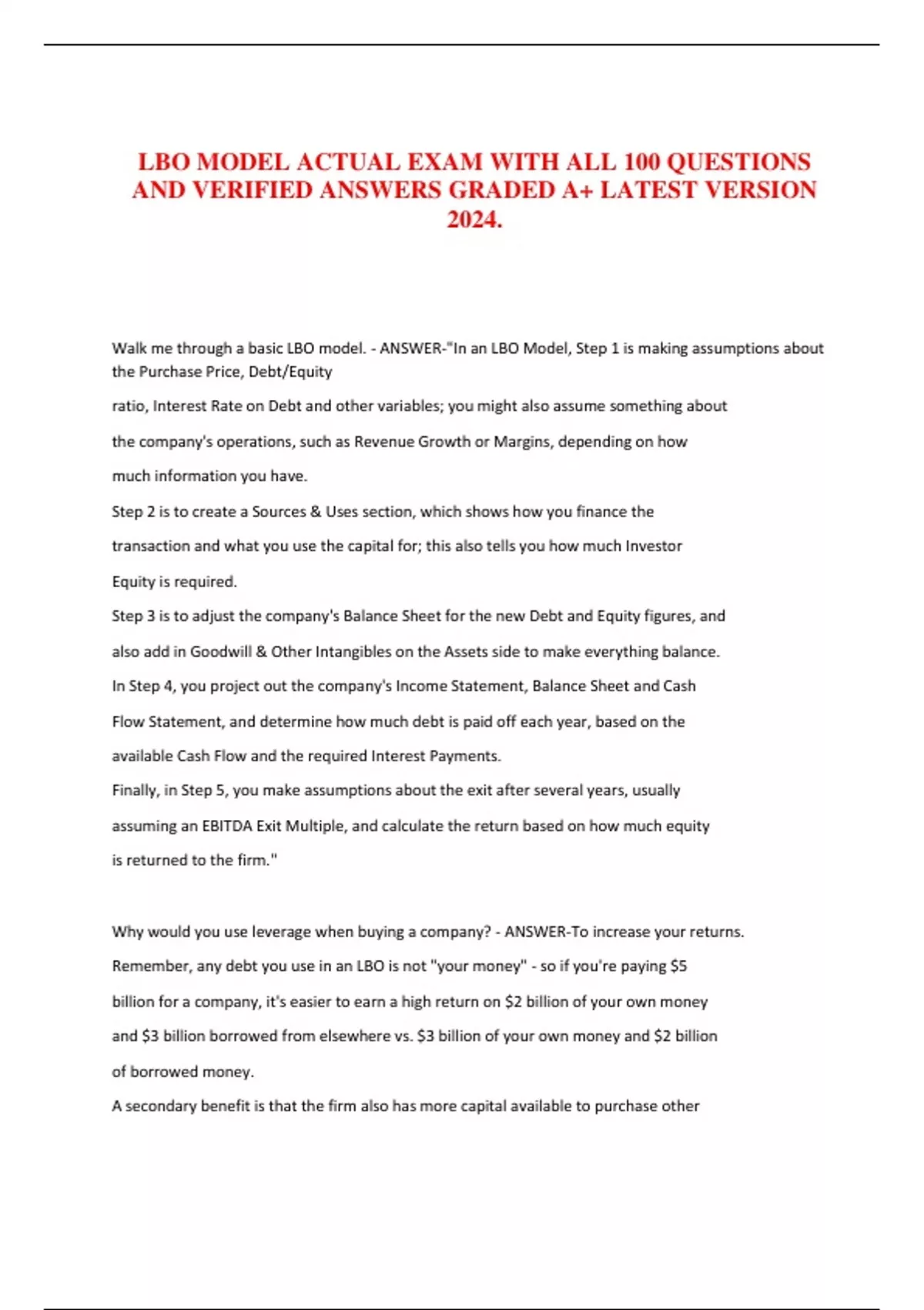 LBO MODEL ACTUAL EXAM WITH ALL 100 QUESTIONS AND VERIFIED ANSWERS GRADED A+ LATEST VERSION 2024.