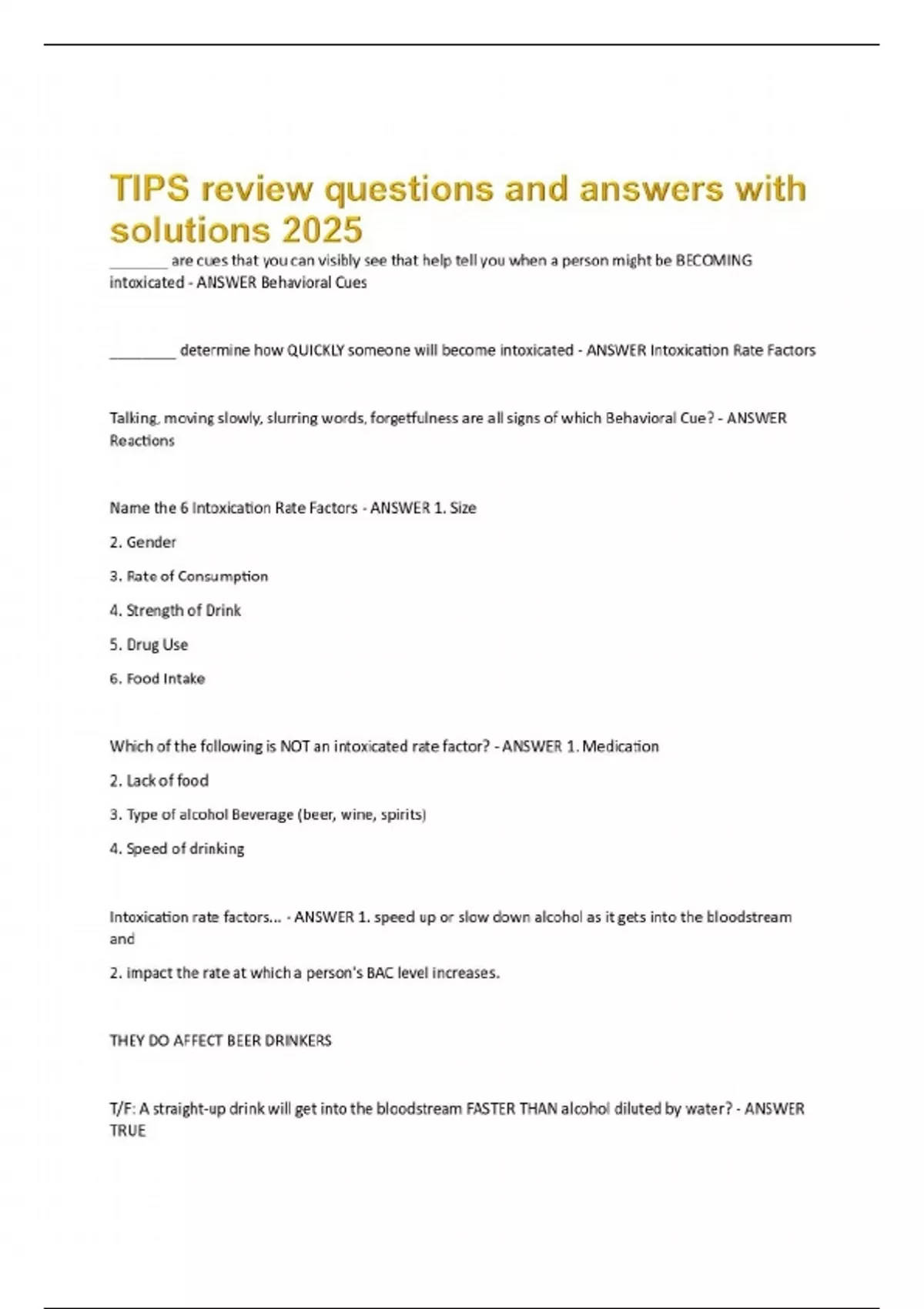 _______ are cues that you can visibly see that help tell you when a person might be BECOMING intoxicated - ANSWER Behavioral Cues ________ determine how QUICKLY someone will become intoxicated - ANSWER Intoxication Rate Factors Talking, moving slowly, slurring words, forgetfulness are all signs of which Behavioral Cue? - ANSWER Reactions Name the 6 Intoxication Rate Factors - ANSWER 1. Size 2. Gender 3. Rate of Consumption 4. Strength of Drink 5. Drug Use 6. Food Intake Which of the following is NOT an intoxicated rate factor? - ANSWER 1. Medication 2. Lack of food 3. Type of alcohol Beverage (beer, wine, spirits) 4. Speed of drinking Intoxication rate factors... - ANSWER 1. speed up or slow down alcohol as it gets into the bloodstream and 2. impact the rate at which a person's BAC level increases. THEY DO AFFECT BEER DRINKERS T/F: A straight-up drink will get into the bloodstream FASTER THAN alcohol diluted by water? - ANSWER TRUE