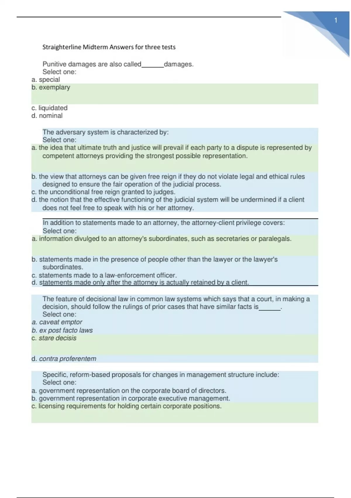 Straighterline Midterm Answers for three tests Punitive damages are also called damages. Select one: a. special c. liquidated d. nominal In addition to statements made to an attorney, the attorney-client privilege covers: Select one: a. information divulged to an attorney's subordinates, such as secretaries or paralegals. b. statements made in the presence of people other than the lawyer or the lawyer's subordinates. c. statements made to a law-enforcement officer. d. statements made only after the attorney is actually retained by a client. b. exemplary 2 b. Four officers of Bisk Corp. devise a highly profitable plan. David, a manager, points out to the group that the plan will likely get the company a high amount of negative publicity. David states that he will not sanction the team's plan. c. Ned, Oliver, and Phoebe draft plans for a new software company. They have all thoroughly researched their plans and no one has any criticisms or concerns. d. Barry, Ralph, and Ann are subordinates of a firm who report problems to their top managers without any fear. a. Ten officers of Jekyll Inc. are planning a business enterprise they know to be highly profitable. Six know the plan to be illegal. Nevertheless, they do not voice their concerns, but go along with the team's plan. Which of the following scenarios best exemplifies groupthink? Select one: c. the values of these constituencies may conflict. he problem with the view that a corporation should attempt to act in the best interests of all of its various constituencies is that: Select one: a. this tactic ignores the corporation's suppliers. b. corporate managers often have a better sense of what is right. Which of the following is a correct statement regarding the Religious Freedom Restoration Act (RFRA)? Select one: d. outsourcing corporate executive management positions. Many corporations initiate legislation in order to: Select one: a. head off the risk of unpredictable lawsuits in the future. b. maximize the risk of more costly regulations for competitors. c. ensure that all legal rules reflect social interests only. d. ensure that their business partners are subject to more rigid constraints than is applicable to them. d. local communities will not benefit from these values. The "dormant" Commerce Clause limits the authority of the states to interfere with the flow of interstate commerce by: Select one: a. limiting the states from furthering only state interests. b. limiting a state's ability to tax vendors. c. prohibiting state legislation that unduly burdens intrastate commerce. d. prohibiting state laws that openly discriminate against interstate commerce. 3 b. This analysis generally requires that the classification serves important governmental objectives and is substantially related to the achievement of those objectives. c. Under this analysis, the statute is unconstitutional unless the government demonstrates that it is pursuing a compelling governmental interest in the least intrusive manner. d. This analysis generally is used to evaluate restrictions on commercial speech or discrimination on the basis of certain suspect classifications. a. This analysis is an extremely lenient level of scrutiny that presumes the regulation is constitutional. Which of the following statements is true of rational basis analysis? Select one: b. Invasion of privacy c. Conversion d. False imprisonment a. Libel Dr. Reilly is a neurosurgeon. He does an interview in a talk show about his occupation and his field. Dr. Reilly goes on to say how Phil Donrey, a famous natural healer who helps people through his Ayurvedic methods, is bogus and how there is no science or logic behind it. For which of the following reasons can Phil Donrey sue Dr. Reilly? Select one: The protects people from arbitrary government interference with their life, liberty, or property rights. Select one: a. procedural due process c. equal protection clause of the fifteenth amendment d. due process clause of the sixth amendment The tort of disparagement: Select one: a. requires proof of actual damage. b. substantive due process b. It does not apply to actions by state governments. c. In instances where a generally applicable federal law substantially burdens the exercise of religion, the government must satisfy the rational basis test. d. It does not apply to actions by the federal government. a. It holds that the federal government may, as a statutory matter, substantially burden a person’s exercise of religion. 4 d. The store has no conditional privileges to stop persons it feels are shoplifting, but it is liable for punitive damages. Seth was shopping at a local music store looking for a CD, when he suddenly remembered that he had an appointment with his math professor. He pulled his calendar out of his backpack only to discover that he was late for the appointment. Seth quickly put the calendar back into his backpack and hurried out of the store. As he made his exit from the store, a security guard asked Seth to accompany him to an office at the back of the store to which he consented. Once there, in private, the guard quickly searched Seth and his backpack thinking him to be a shoplifter, but found nothing. The whole incident took less than three minutes. Which of the following is most likely to be true regarding this incident? Select one: a. Seth has enough evidence against the store to sue them for defamation. b. Seth has enough evidence against the store to sue them for false imprisonment, emotional distress, and battery. c. If the store belongs to a state that allows conditional privilege to store owners, the store can stop persons it feels are shoplifting. d. It is identical to intentional wrongdoing. c. It is more morally objectionable than negligence but less than intentional wrongdoing. Which of the following statements is true about recklessness? Select one: a. Assumption of risk is not a good defense for recklessness. b. It is best defended with a plea of contributo
