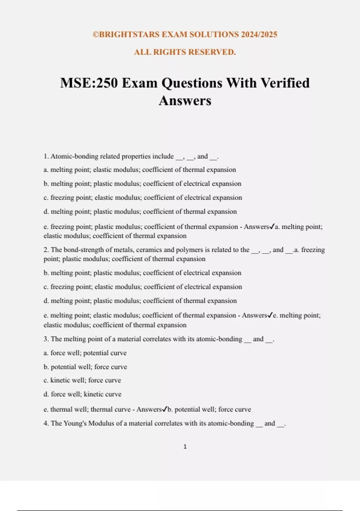 e. melting point; elastic modulus; coefficient of thermal expansion - Answers✔e. melting point;