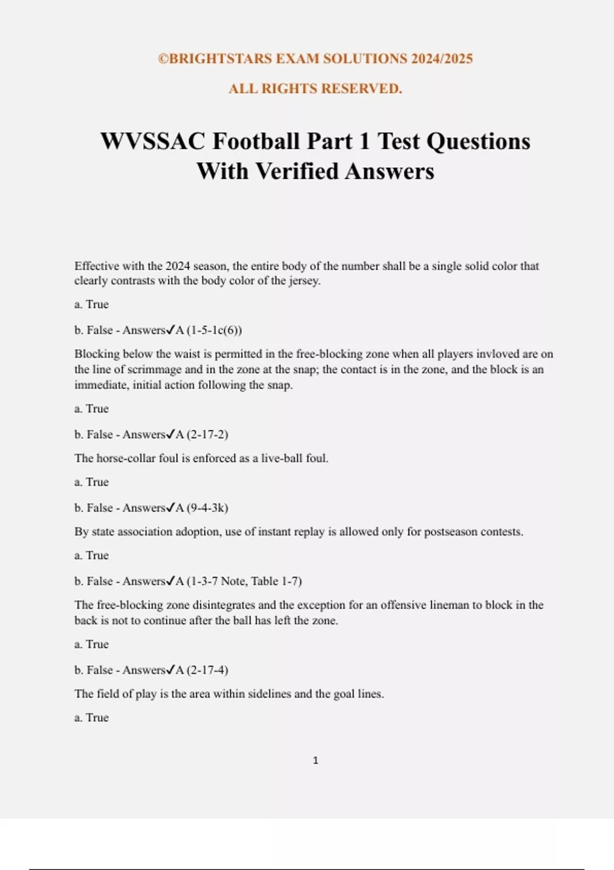 ©BRIGHTSTARS EXAM SOLUTIONS 2024/2025 ALL RIGHTS RESERVED. 1 WVSSAC Football Part 1 Test Questions With Verified Answers Effective with the 2024 season, the entire body of the number shall be a single solid color that clearly contrasts with the body color of the jersey. a. True b. False - AnswersA (1-5-1c(6)) Blocking below the waist is permitted in the free-blocking zone when all players invloved are on the line of scrimmage and in the zone at the snap; the contact is in the zone, and the block is an immediate, initial action following the snap. a. True b. False - AnswersA (2-17-2) The horse-collar foul is enforced as a live-ball foul. a. True b. False - AnswersA (9-4-3k) By state association adoption, use of instant replay is allowed only for postseason contests. a. True b. False - AnswersA (1-3-7 Note, Table 1-7) The free-blocking zone disintegrates and the exception for an offensive lineman to block in the back is not to continue after the ball has left the zone. a. True b. False - AnswersA (2-17-4) The field of play is the area within sidelines and the goal lines. a. True ©BRIGHTSTARS EXAM SOLUTIONS 2024/2025 ALL RIGHTS RESERVED. 2 b. False - AnswersA (2-10-2) When R1 gains possession of a free kick, blocking below the waist by teammates is legal. a. True b. False - AnswersB (9-3-2) A down ends when the live ball becomes dead. a. True b. False - AnswersA (2-7-1, 4-2-2) Any receiver may signal for a fair catch while any legal kick is in flight. a. True b. False - AnswersA (6-5-1) If there is a double foul during the last timed down of a period, the period is automatically extended. a. True b. False - AnswersA (3-3-3B) A signal given by R1 in or behind the neutral zone during a scrimmage kick is an illegal fair- catch signal. a. True b. False - AnswersB (2-9-1, 2-9-5) The succeeding spot is where the ball was last snapped or free kicked. a. True b. False - AnswersB (2-41-10) If the game is interrupted due to the weather during the last three minutes of the second period, and the delay is at least 30 minutes, the opposing coaches can mutually agree to shorten halftime intermission, provided there is at least a one-minute intermission (not including the three-minute warm-up period). a. True b. False - AnswersA (3-1-6c Exception) A disqualified player shall be removed even if the penalty for the foul is declined.