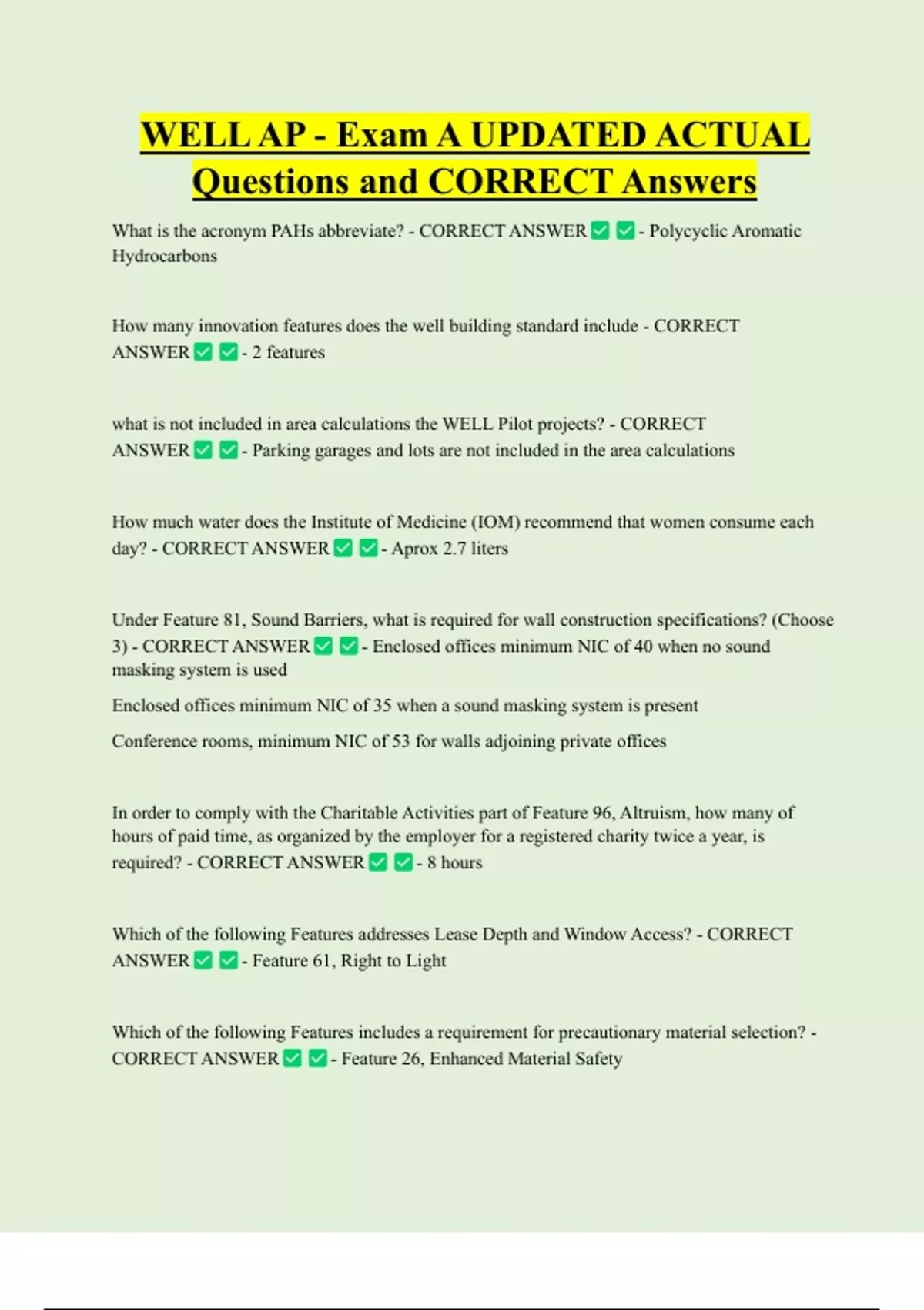 WELL AP - Exam A UPDATED ACTUAL Questions and CORRECT Answers What is the acronym PAHs abbreviate? - CORRECT ANSWER - Polycyclic Aromatic Hydrocarbons How many innovation features does the well building standard include - CORRECT ANSWER - 2 feature