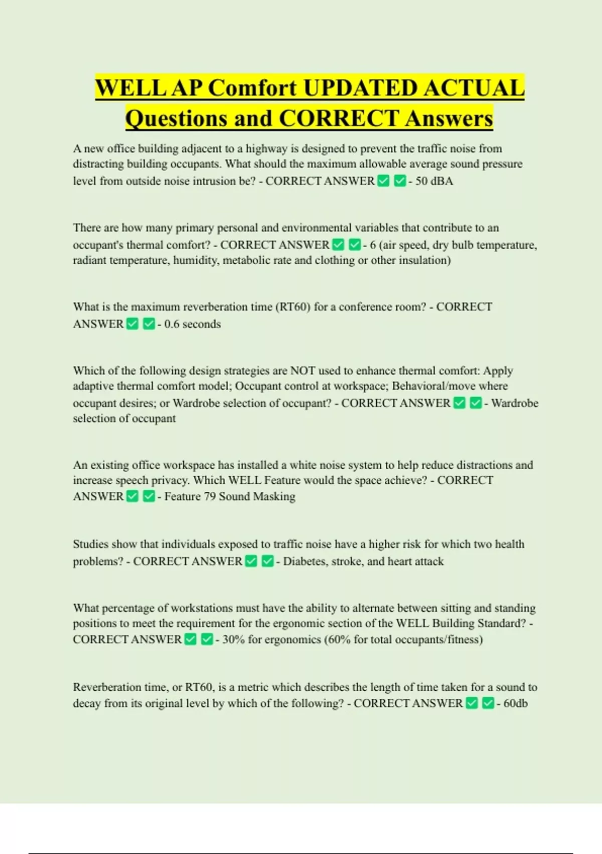 WELL AP Comfort UPDATED ACTUAL Questions and CORRECT Answers A new office building adjacent to a highway is designed to prevent the traffic noise from distracting building occupants. What should the maximum allowable average sound pressure level from outside noise intrusion be? - CORRECT ANSWER - 50 dBA There are how many primary personal and environmental variables that contribute to an occupant's thermal comfort? - CORRECT ANSWER - 6 (air speed, dry bulb temperature, radiant temperature, humidity, metabolic rate and clothing or other insulation