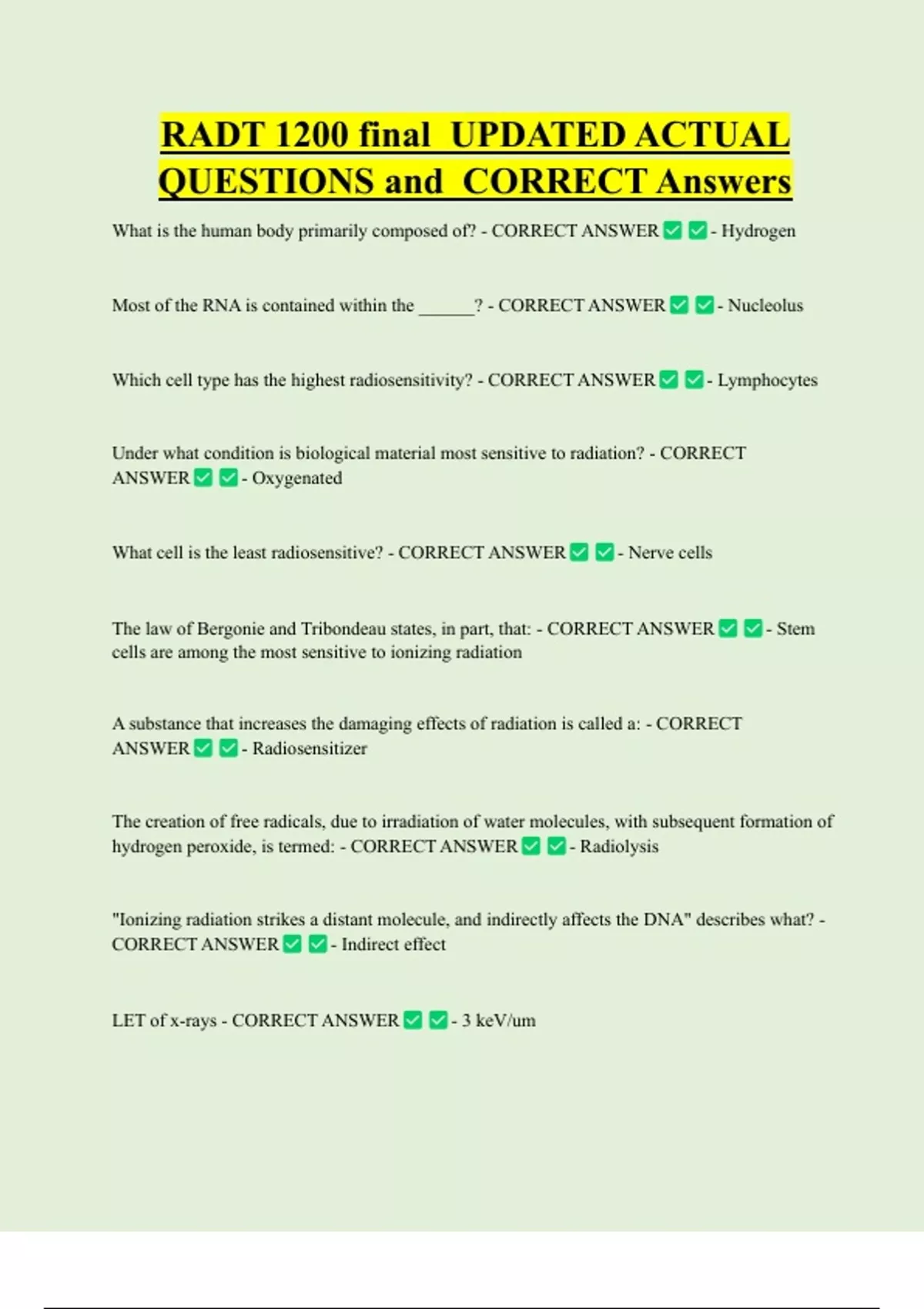 RADT 1200 final UPDATED ACTUAL QUESTIONS and CORRECT Answers What is the human body primarily composed of? - CORRECT ANSWER - Hydrogen Most of the RNA is contained within the ______? - CORRECT ANSWER - Nucleolus Which cell type has the highest radiosensitivity? - CORRECT ANSWER - Lymphocyte