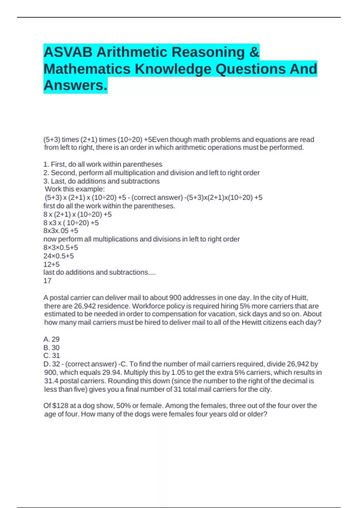 ASVAB Arithmetic Reasoning & Mathematics Knowledge Questions And Answers.