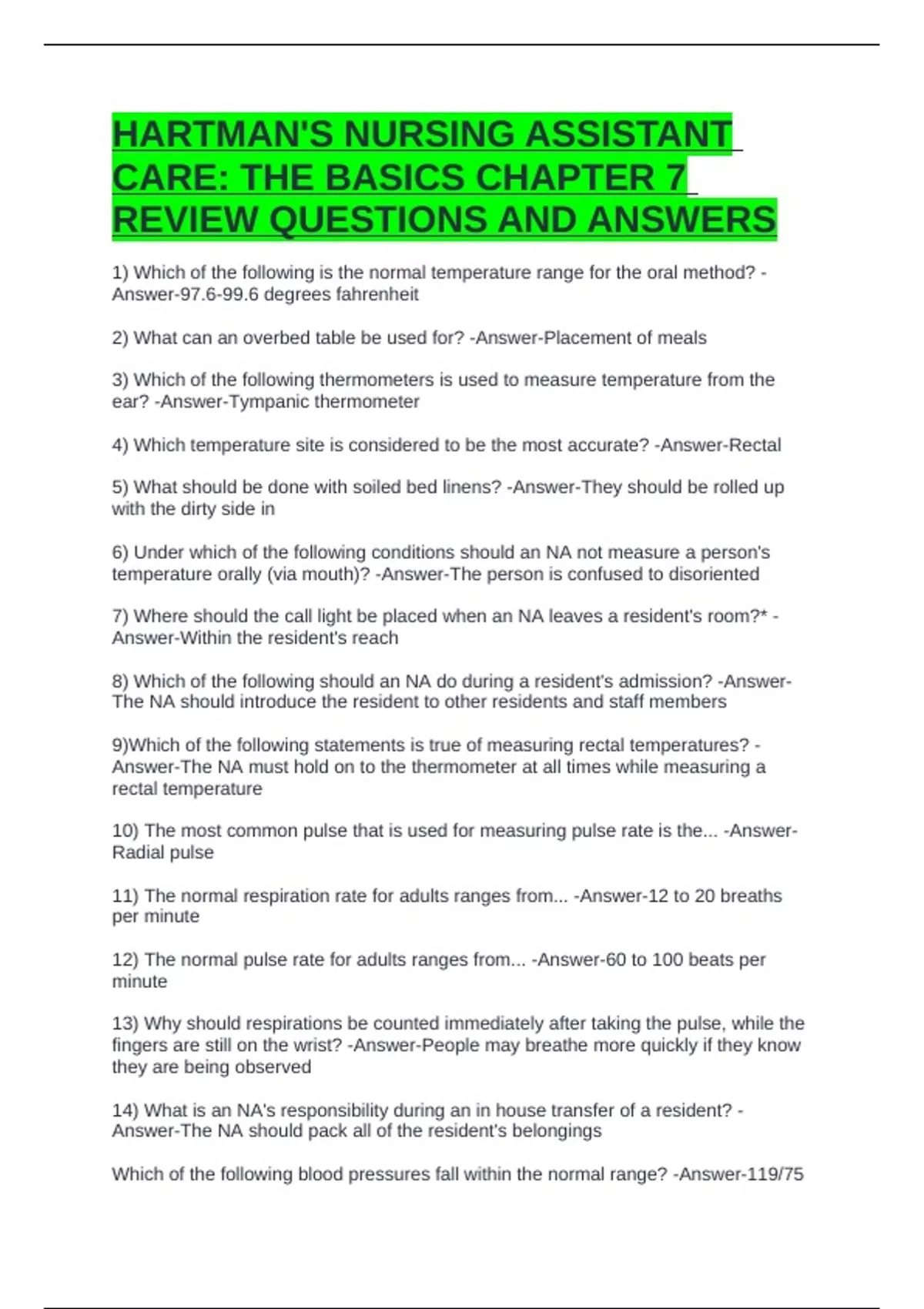 12) The normal pulse rate for adults ranges from... -Answer-60 to 100 beats per