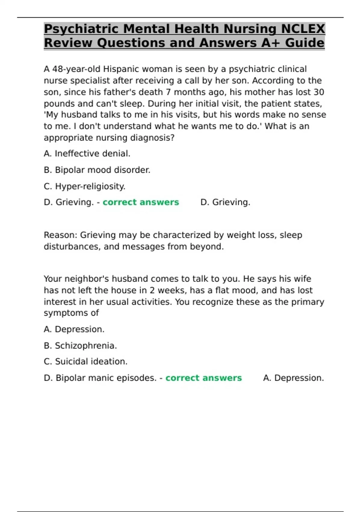 Psychiatric Mental Health Nursing NCLEX Review Questions and Answers A+ Guide