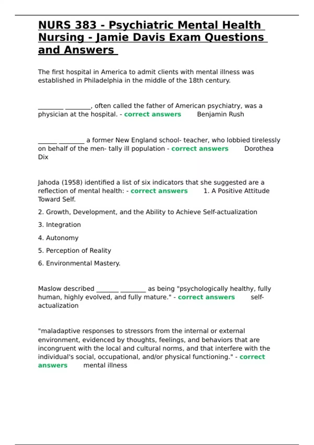 NURS 383 - Psychiatric Mental Health Nursing - Jamie Davis Exam Questions and Answers